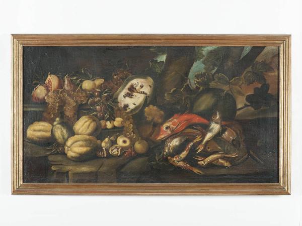 Olio su tela raffigurante una natura morta con frutta e pesci. Sullo sfondo, si intravede un paesaggio.\nSi descrivono con straordinaria verosimiglianza frutti e pesci di diversa specie: elegante composizione dedicata alla fauna ittica e al mondo vegetale, presentata su un ripiano con straordinaria intensità visiva. \nDipinto entro cornice in legno modanato e dorato.