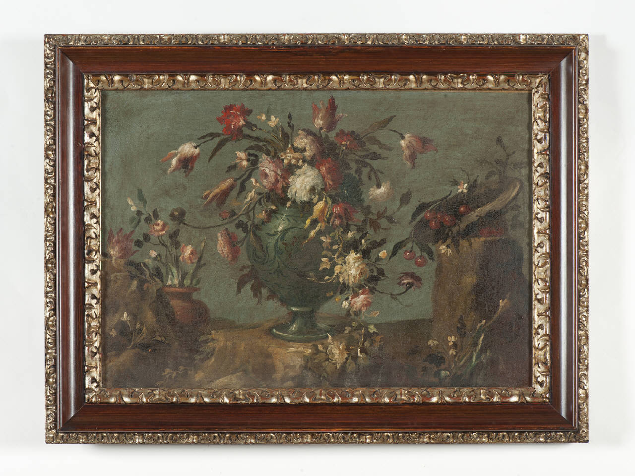 Olio su tela con vaso di fiori, entro una cornice in legno intagliato e dorato, molto probabilmente successiva rispetto alla datazione del dipinto.