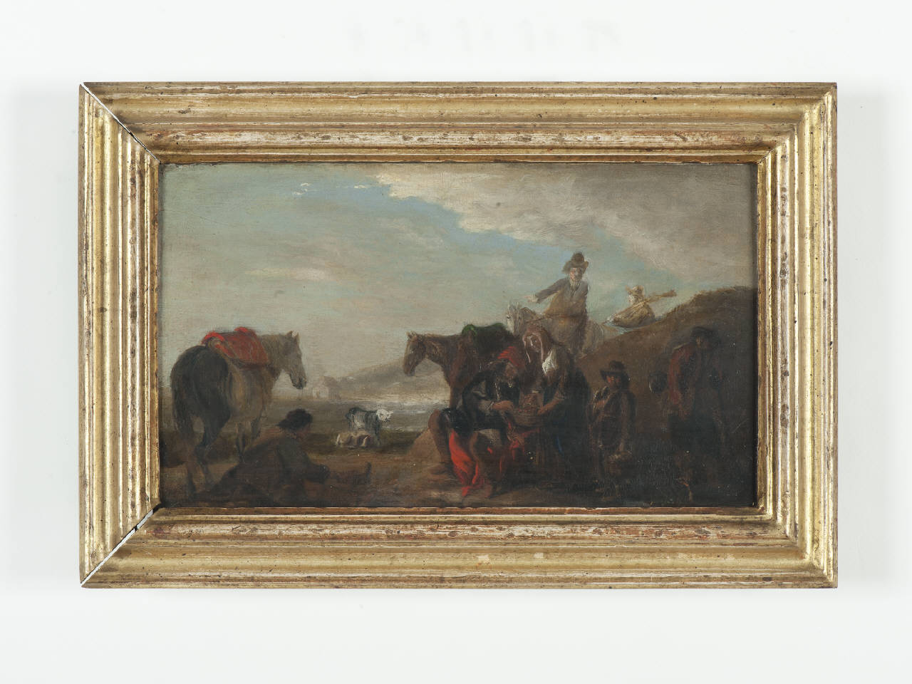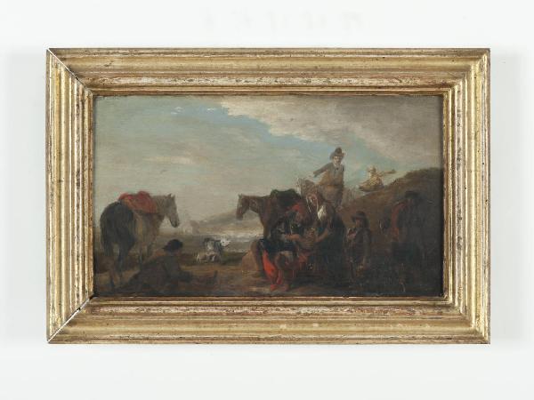 Olio su tavola con la raffigurazione della sosta di viandanti durante un viaggio. \nDipinto entro una semplice cornice in legno modanato e dorato.