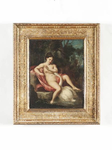 Olio su tela con la raffigurazione del mito di Leda e il cigno.\nDipinto entro cornice in pastiglia dorata.