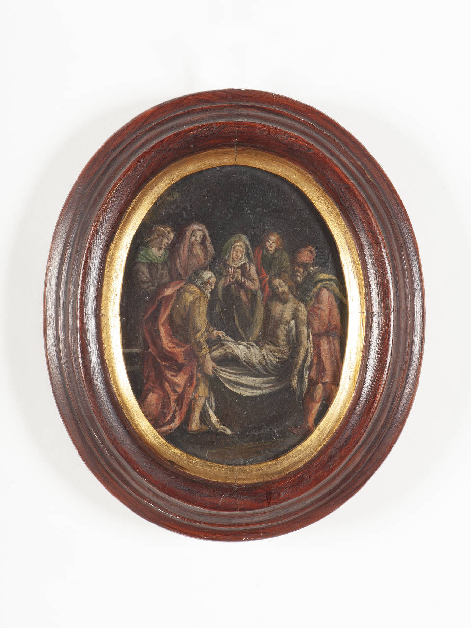 Olio su rame con la raffigurazione della deposizione di Cristo dalla croce. Di forma ovale, con cornice lignea semplice, con doratura nella parte interna.\nPredominanza di tonalità calde di colore che accentuano ancor più la drammaticità dell'evento raffigurato. I personaggi emergono dallo sfondo scuro cosicchè l'attenzione dell'osservatore è diretta principalmente a loro.