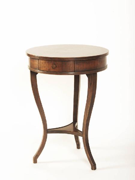 Tavolino tondo sostenuto da tre gambe raccordate tra loro da una traversa inferiore; piccolo cassetto nella parte superiore.