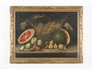 Dipinto inserito in una cornice in legno intagliato e dorato.\nDal fondo scuro, emergono in primo piano i vari elementi che costituiscono la composizione, poggianti su un piano di appoggio. La luce, proveniente da sinistra, crea effetti chiaroscurali che sottolineano la verità, il realismo dei frutti rappresentati; una luce indagatrice, che mette in risalto la consistenza delle forme, i materiali. Predominano tonalità calde di colore che evidenziano ancor più l'umile verità che traspare dalla composizione.