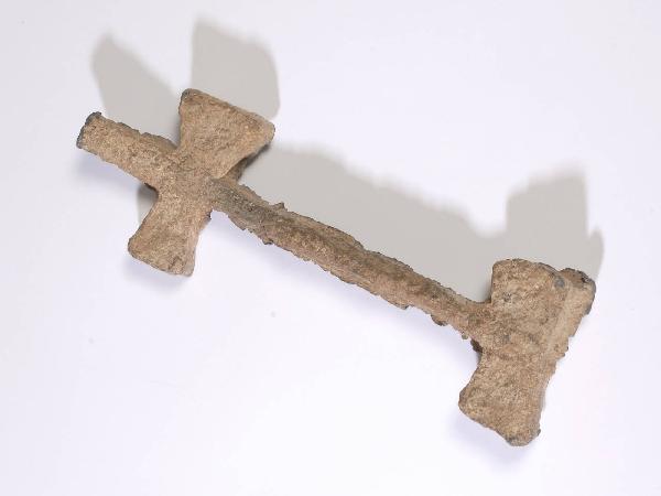 Sorta di oggetto devozionale a forma di croce: segni incisi lungo la superficie superiore del manufatto.