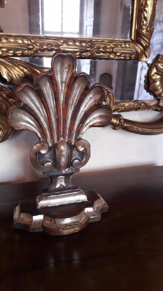 Due elementi decorativi in legno intagliato e argentato, rimaneggiati in epoca successiva e trasformati in mensole da fissare al muro.