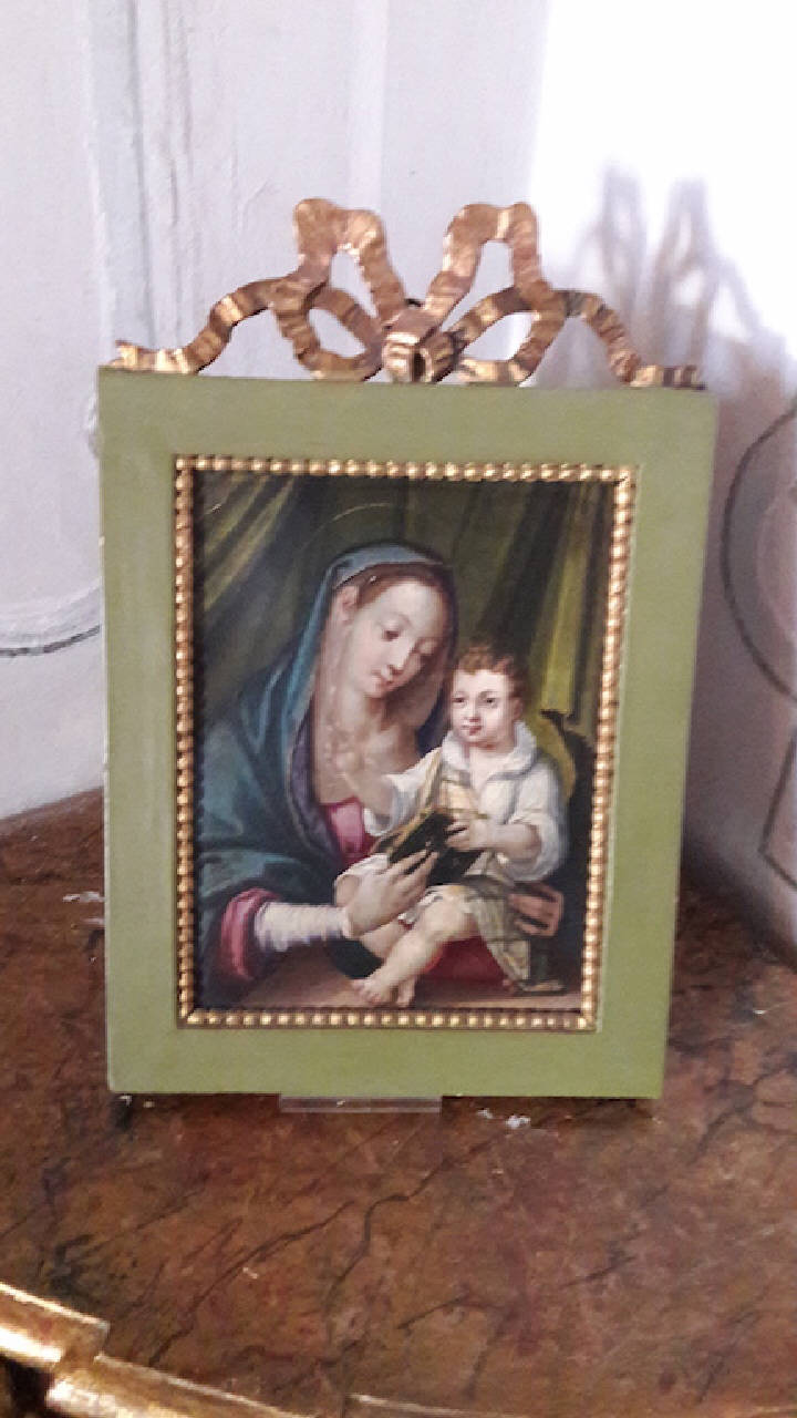 Dipinto su rame inserito in una cornice in legno dipinto in verde con cartiglio dorato nella parte superiore.