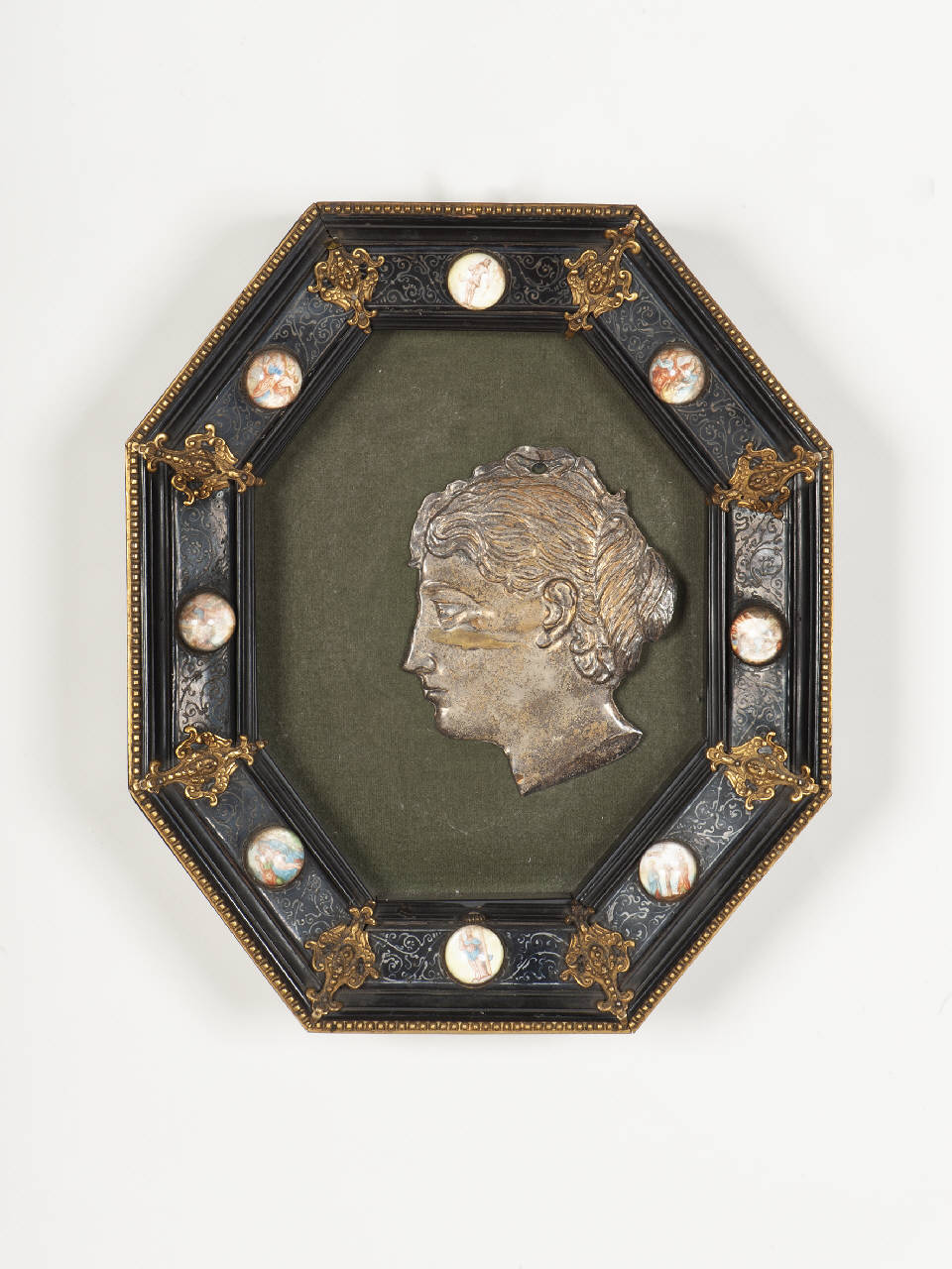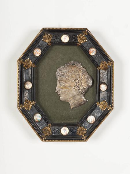 Cornice poligonale in legno dipinto con finiture e fregi in bronzo dorato, piccole miniature a smalto incastonate nella medesima cornice che raffigurano episodi della vita di Cristo. All'interno della cornice è presente un rilievo in ottone sbalzato e argentato raffigurante un volto femminile visto di profilo: molto probabilmente il rilievo in questione non è pertinente.