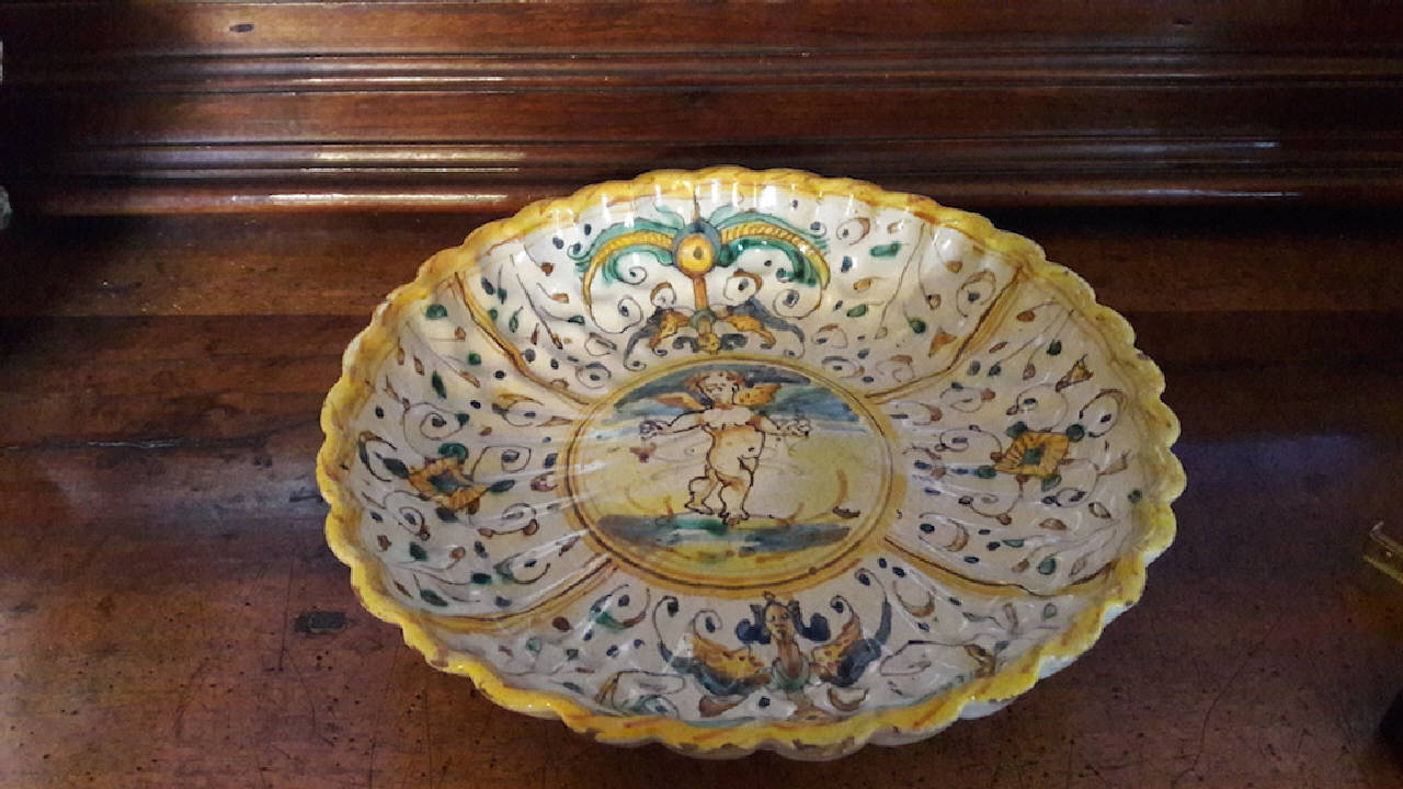 Maiolica policroma a gran fuoco. Corpo bacellato, bordo orlato. Base rialzata, incavata. Un putto alato entro il decoro "a quartieri" con arpie ed elementi floreali.