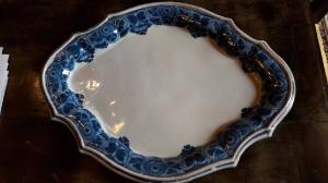 Vassoio polilobato decorato con motivi decorativi floreali in diverse tonalità del blu.\nAssenza del marchio di fabbrica.