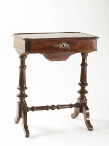 Tavolino da lavoro: piano d'appoggio sagomato, cassetto con serratura, gambe tornite unite da traversa.