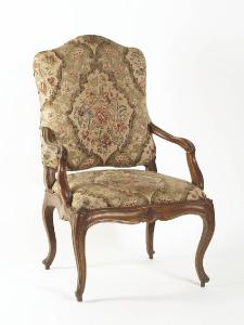 Poltrona in legno di noce modanato e intagliato.\nBraccioli mossi in legno intagliato; schienale e fronte mosso, gambe scanalate. Il sedile e lo schienale sono imbottiti e rivestiti da tessuto con motivi decorativi floreali.