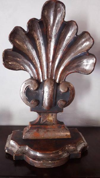 Due elementi decorativi in legno intagliato e argentato, rimaneggiati in epoca successiva e trasformati in mensole da fissare al muro.