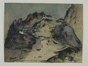 - NOTIZIE STORICO CRITICHE Maceo Casadei si colloca all'interno delle diverse correnti artistiche del Novecento come una figura indipendente nel vasto panorama culturale del XX secolo. Il pittore forlivese dopo una prima formazione di stampo postimpressionista a Lione nel 1917 è costretto a tornare in Italia per combattere la Grande Guerra. In quell'anno viene arruolato come mitragliere reggimentale alla 211a Compagnia che guerreggiava in Trentino e dove tra i monti e le trincee non smise di dipingere e disegnare. "Pur nella condizioni di profonda solitudine morale, il giovane artista avrebbe saputo affrontare quella situazione di grave disaggio conservando un proprio equilibrio e le libertà di fantasia. Anzi, essa non costituì un limite ma divenne pretesto per una non esamine interpretazione di temi ingrati e amari" (G. Viroli, Maceo Casadei. Catalogo generale - I, Forlì 1998, p. 9). \nAll'interno delle raccolte del Gabinetto di Disegni del Castello Sforzesco si conservano del pittore forlivese un vasto numero di opere realizzate durante la Prima e la Seconda Guerra Mondiale. Datati al 1918 sono alcuni disegni (Invv. Agg. 69; 71; 230; 231; 233; 235, 236; 237; 238), donati dall'artista alle raccolte pubbliche nel 1964, insieme a un nucleo di altri sette disegni (invv. Agg. 239; 70; 228; 229; 234; 232; 68), eseguiti negli anni Quaranta, quando lavorava come fotografo e pittore documentarista per il "reparto guerra" dell'Istituto Nazionale Luce. La donazione di tali opere incrementò la raccolta di Maceo Casadei all'interno delle raccolte di grafica del Castello Sforzesco; nel 1942 infatti erano stati acquistati dal comune presso la Galleria Il Milione quindici fogli di guerra (invv. 1949/1 C 202/1 - 1949/15 C 202/15) esposti dalla galleria milanese alla fine del 1942.\nI disegni eseguiti nel 1918 tra le Alpi del Veneto e del Trentino descrivono paesaggi rocciosi e montagne; in alcuni di essi capeggiano diverse case e baraccamenti o figure di bersaglieri. I disegni, realizzati attraverso veloci tratti di carboncino, matita o inchiostro nero sono caratterizzati da acquerellature di tonalità marroni e grigiastre che si contrappongono all'azzurro del cielo, attraverso variazioni cromatiche di grande intensità espressiva.