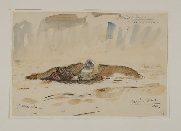 - NOTIZIE STORICO CRITICHE Quando nel 1940 l'Italia entrò in guerra a fianco della Germania, Maceo Casadei partì come volontario con il "reparto guerra", in qualità di pittore e fotoreporter per l'Istituto Nazionale Luce, con l'obbiettivo di documentare le operazioni belliche delle truppe italiane. Nelle sue memorie, scritte tra il 1950 e il 1960, l'artista forlivese racconta dettagliatamente tutti i momenti del conflitto a cui prese parte e offre un minuzioso resoconto della sua attività e dei suoi spostamenti. Delle sue esperienze si ha testimonianza nelle circa 6000 fotografie scattate e nelle oltre 400 "impressioni" realizzate in dipinti e disegni. Dopo alcune missioni nei mari italiani, e avendo girovagato in largo e in lungo per la penisola, nell'ottobre del 1941 Maceo si sposta in Africa settentrionale. Cosi scrive: "mi venne il desiderio di recarmi sui fronti in terra Africana, sicuro di poter raccogliere un maggior materiale di guerra, ed un diverso 'color locale' […] Dopo Tripoli, El Adem e Tobruk, ci dirigemmo a Bir-El-Gobi per riprendere le ultime fasi di una crudele battaglia" (A. Imbellone, Maceo: anni Romani, 1934-1944, Cinisello Balsamo 2008, p. 34). Nella primavera del 1942, dopo il passaggio da Dumini e Tauorga, Maceo chiese e ottenne il permesso di far ritorno a Roma, e tra il maggio e il giugno dello stesso anno allestisce alle Terme di Roma la sua prima personale di guerra, presentando una quarantina di opere. \nDal 30 settembre al 12 ottobre del 1942, invece, la Galleria milanese del Milione ospitò la seconda mostra di guerra di Maceo, questa volta formata da soli disegni e guazzi, per un totale di 32 fogli. Nel testo introduttivo alla mostra, firmato da Attilio Crespi, il critico sottolinea l'altissima capacità raggiunta dall'artista forlivese a far luce e inquadrare le scene, raccogliendo gesti e atteggiamenti attraverso una schietta emotività. Lo stesso Maceo ricorda nelle sue memorie manoscritte, il grande successo di critica e di pubblico ottenuto dalla mostra e la triste chiusura a causa del primo bombardamento aereo su Milano.\nDi questi disegni, secondo le parole dell'artista, 28 furono venduti: 8 acquistati da privati, 5 dal Museo del Rinascimento di Milano e la rimanenza dal comune del capoluogo lombardo e destinati alle Raccolte Bertarelli. A questi 15 fogli, oggi conservati all'interno del Civico Gabinetto di Disegni (invv. 1949/1 C 202/1 - 1949/15 C 202/15), si è aggiunto un altro nucleo donato dal pittore intorno agli inizi degli anni Sessanta. Essi comprendono alcune opere eseguite come le precedenti durante la campagna in Africa (invv. Agg. 239; 70; 228; 229; 234), e altri disegni datati al 1918, al 1943 e al 1944 (invv. Agg. 68-71; 228-238). I disegni di guerra di Maceo Casadei realizzati tra il 1941 e il 1942 si distaccano, nella maggior parte dei casi, dal tipico filone documentario per un carattere di sintetica immediatezza e vibrazione lirica del colore. Il mutare rapido della scena costringe l'artista a immortalare il gemito della raffigurazione tramite tratti veloci di inchiostro di china e linee spezzate in supporti cartacei, alcuni dei quali di fortuna: pagine di protocollo stampato, fogli di taccuino o di diario. Così scrisse "fotografo e disegno scarabocchiando fogli su fogli di carta d'ogni tipo e colore" (Ivi). Attraverso il filtro del suo sguardo Maceo concentra il dramma della guerra in una rappresentazione piena di dinamicità, dove il dolore non è raffigurato attraverso le figure, che risultano schematiche e abbozzate, ma in una resa violenta del conflitto armato. Attraverso un tratto veloce e schizzato con variazioni delicate di colore diluito, la guerra è tratteggiata in lontananza con i soldati in corteo tra le sterminate dune del deserto o all'interno di buche scavate nella terra; tra i mari in mezzo agli scontri navali o nei campi di battaglia tra i carri armati. Oltre a ciò Casadei realizza alcuni splendidi paesaggi di deserto inserendo in alcuni casi non solo i cortei delle truppe militari, ma anche piccole figurine schizzate o accampamenti di beduini. Inoltre, con l'intento di offrire il ricordo di quei terribili ma avventurosi momenti, ogni foglio è contraddistinto, oltre che da data e firma, dalla presenza di note autografe con il quale l'artista regista le vicende che raffigura.