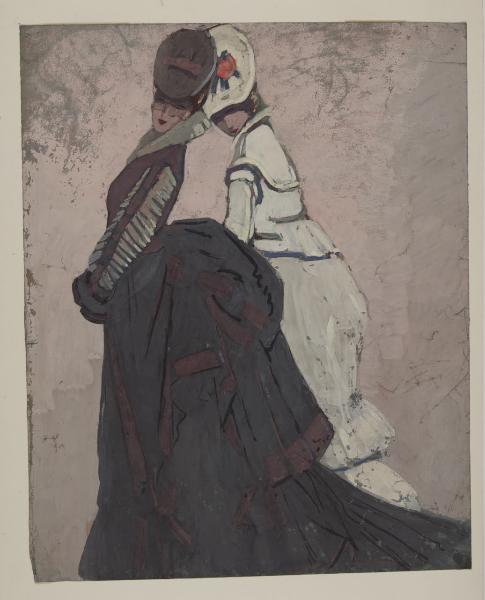 - NOTIZIE STORICO CRITICHE Dopo l’esperienza in Sud America (dal 1908 al 1911), Enrico Sacchetti raggiunge in Francia l'amico Libero Andreotti. Qui l’artista avrebbe voluto spopolare come caricaturista politico e sociale, ma in breve tempo divenne un esclusivo commentatore di eleganza femminile. "Nella Parigi di allora, subito vide che le donne costituivano uno spettacolo buffo, divertente, sempre nuovo; [...] centinaia di donne si muovevano paludate nelle fogge più strane, creature fatte di colore, di chiffon, di piume, di profumo, grandi e costosi giocattoli... Quella era già una mostra di caricature che si offriva agli occhi meravigliati dell’artista." (G. Fanciulli, Enrico Sacchetti, in "Emporium", v. XLIX. 1919, p. 23). In quella città brulicante di estrosi personaggi, Sacchetti diventa ben presto uno dei più originali e quotati specialisti di moda; disegni e acquerelli furono, infatti, pubblicati su «La Gazette du bon ton», su la «Tout Paris», «Les Modes» e «La vie parisienne». Sempre più apprezzato e ricercato, l’artista incontra il plauso dei più fini conoscitori e rimase a Parigi fino allo spoppio della Prima Guerra Mondiale, quando fu costretto a tornare in Italia. Il disegno a tempera denomninato "Le Civette", ritrae due donne sorridenti che ammiccano maliziose un ipotetico osservatore e che rimandano all’ambiente bohémien parigino e alla moda del periodo. Tuttavia le due donne si discostano dalle sottili e sinuose figure realizzare da Sacchetti per le riviste francesci. Esse sembrerebbe, infatti, stilisticamente più affini alla serie di cartoline d’arte dedicate alle moda femminile, pubblicate nel 1917, o a quelle apparse sulle copertine della «Lettura» di qualche anno dopo. Le due figure mantengono, comunque, quella sarcastica ironia tipica dei bozzetti femminili, realizzati da Sacchetti intorno agli anni Dieci (cfr. Enrico Sacchetti, Ritratti, moda e illustrazioni, Legnano 1989).