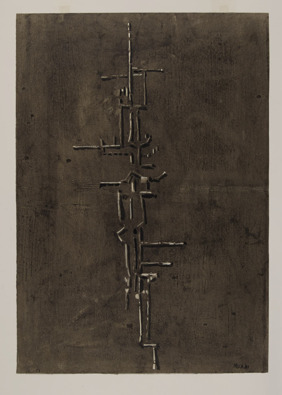 - NOTIZIE STORICO CRITICHE L’opera è stata esposta in occasione della mostra "Umberto Milani. Opere 1933-1967" presso la Permanente di Milano nel 2000. Si tratta di uno studio preparatorio per un pannello in bronzo da realizzarsi per la libreria a elementi modulari progettata per il soggiorno di casa Masini. L’artista ha partecipato al progetto grazie all’invito dell’architetto Luciano Baldessari, suo stretto collaboratore in diverse occasioni. I percorsi tracciati sulla superficie, che si allungano verso diverse direzioni e direttici, sono netti e nitidi. I segni si dispongono in maniera rigorosa e ordinata, mentre le ombreggiature ne danno il rilievo. Sarà lo stesso Milani a parlare di "grafia" riferendosi alle sue opere degli anni Cinquanta: "Una grafia personale volta ad esprimere un pensiero, un sentimento con la composizione ‘elementare’ di elementi plastici elementari (linee, piani, spessori, tratti)" (M. De Micheli, Scultura italiana del dopoguerra, Milano 1958, pp. 241-242). In queste opere, in effetti, si notano una forma e un segno costruiti scrupolosamente quasi a suggerire l’idea di una scrittura a rilievo. La ricerca di questi studi sarà trasposta in scultura nella serie delle "Plastiche parietali", opere nate per conciliare il lavoro scultoreo con l’architettura e l’arredamento. Il disegno in questione, elemento decorativo per una libreria, si inserisce, dunque, nel percorso creativo di questi anni.