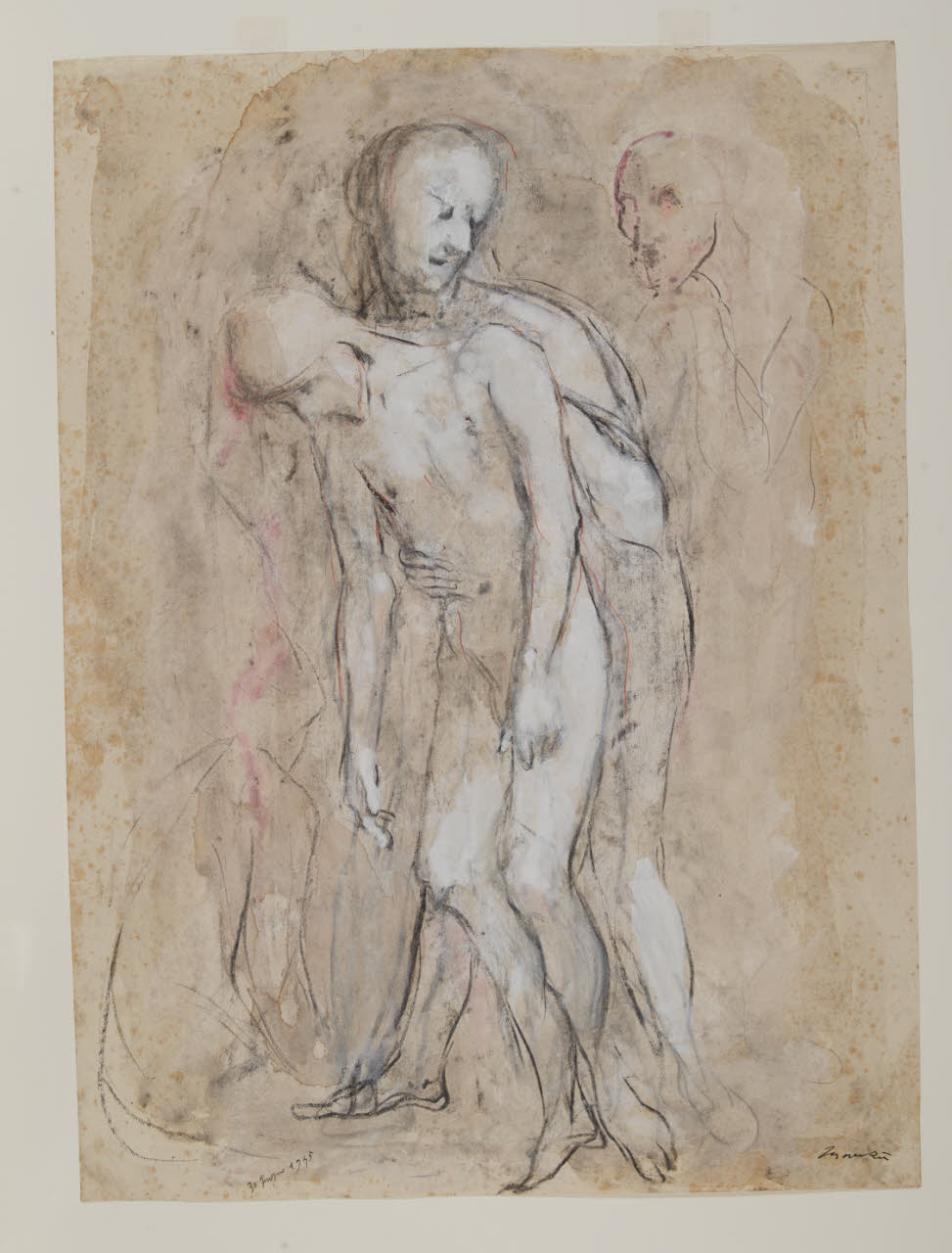 - NOTIZIE STORICO CRITICHE I disastri causati dalla Seconda guerra mondiale hanno prodotto tra gli artisti un forte senso di disperazione e un estremo bisogno di raffigurare il sacro. Interprete di tale necessità fu Giacomo Manzù il quale, mentre nel 1945 presentava gli studi sul tema della Crocifissione, bassorilievi realizzati tra il 1939 e il 1942, annunciava la realizzazione di altre due serie di opere: la Pietà e il Convegno dei Santi e martiri (Dallaj 1991). A queste opere e alla Pietà Rondanini di Michelangelo gli studiosi hanno messo in relazione i due disegni con i rispettivi studi (sul verso di ogni foglio), realizzati dall'artista nel 1945 e acquistati per le Raccolte Civiche Milanesi nel 1953 (invv. 428 Recto, inv. 429 Recto)\nLa composizione di tali opere riprende, infatti, uno degli ultimi bassorilievi della Crocifissione dell'artista, costruita sulla centralità verticale del corpo di Cristo, e si riallaccia all'opera michelangiolesca "nell'urgenza di catturarne, attraverso il segno, il vibrante luminismo della superba 'plastica come frammento' tanto congeniale alla sensibilità di Manzù" (Dallaj 1991). Come osservato da Paolo Rusconi, inoltre, il legame iconografico e l'intensa drammaticità comune all'opera di Michelangelo si evince chiaramente dallo schizzo a matita presente sul verso di uno dei fogli; esso è presentato "nel voluto arcaismo della composizione e nella disposizione delle figure. La ricerca di contorni crudamente segnati e di anatomie al limite della deformazione, manifestano l'interesse per la cultura del Nord e per una religiosità severa, attenta alle sensibilità individuali" (Rusconi 2001).