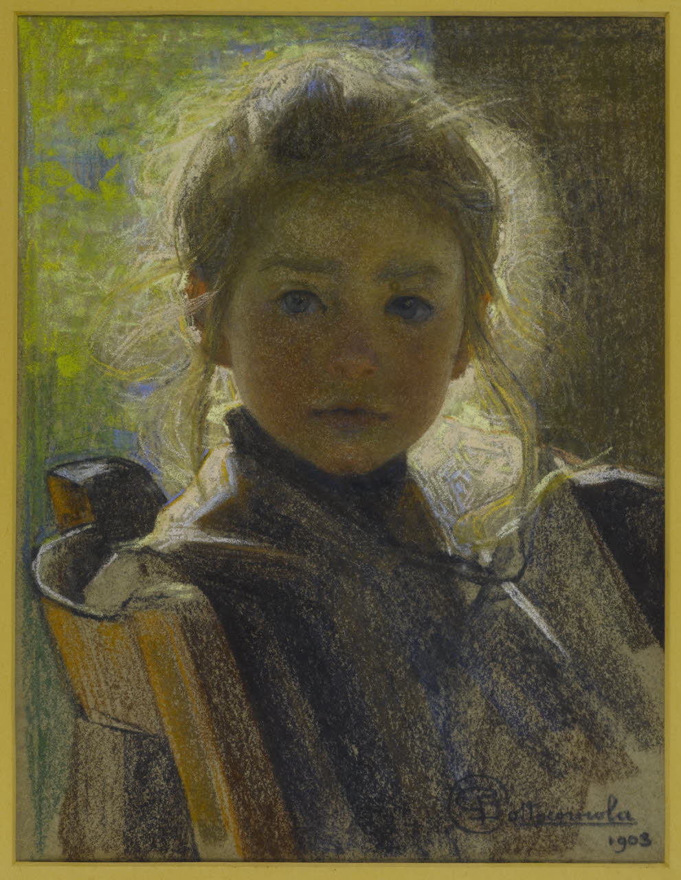 - NOTIZIE STORICO CRITICHE Intorno al 1895 i temi dell'opera di Giovanni Sottocornola si spostano dai soggetti sociali a quelli famigliari; raffigurazioni di vita privata, come gli intensi ritratti della moglie, delle figlie Anita e Maria o dell'adorata nipote Ersilia. La casa, il giardino, la terrazza, diventano gli ambienti ideali nei quali ospitare queste nuove protagoniste femminili. L'artista crea adesso opere che, ancora legate alla pittura simbolista, vedono l'utilizzo di nuovi materiali, come i colori a pastello; tecnica che inizierà a privilegiare rispetto ad altre, e che diverrà predominante però, solo negli anni successivi. \nLa figlia del pittore Maria nacque nel 1897, divenendone uno dei soggetti prediletti. Il disegno, acquistato presso la vedova dell'artista nel 1918, raffigura la piccola Mariuccia all'età di sei anni. In questo intenso ritratto a pastello, ciò che risalta è l'abile resa del volto del soggetto, che, sebbene in controluce, risulta comunque ben evidenziato. La piccola Maria volge lo sguardo al padre, o a un ipotetico osservatore e mostra un'espressione seria ma dolce e serena, con i capelli color cenere sui quali è perfettamente riprodotto l'effetto di trasparenza dato dalla luce. Quest'ultima mette inoltre in risalto gli occhi chiari e le guancie rosee, in un uso calibrato del pastello di derivazione divisionista, in cui l'insieme delle impercettibili variazioni tonali del colore, accostate a minuscole lumeggiature di bianco conferiscono all'immagine caratteri trascendentali.\nLo splendido ritratto, ospitato tra gli anni Settanta e Ottanta del Novecento all'interno di diversi uffici pubblici (Villa Mirabellino, parco di Monza, e successivamente presso la Ripartizione Educazione e la Ripartizione Finanze Tributarie), dal 1991 è custodito dal Civico Gabinetto di Disegni del Castello Sforzesco.