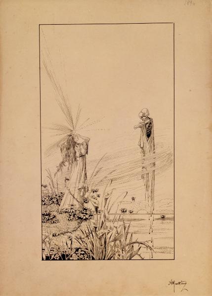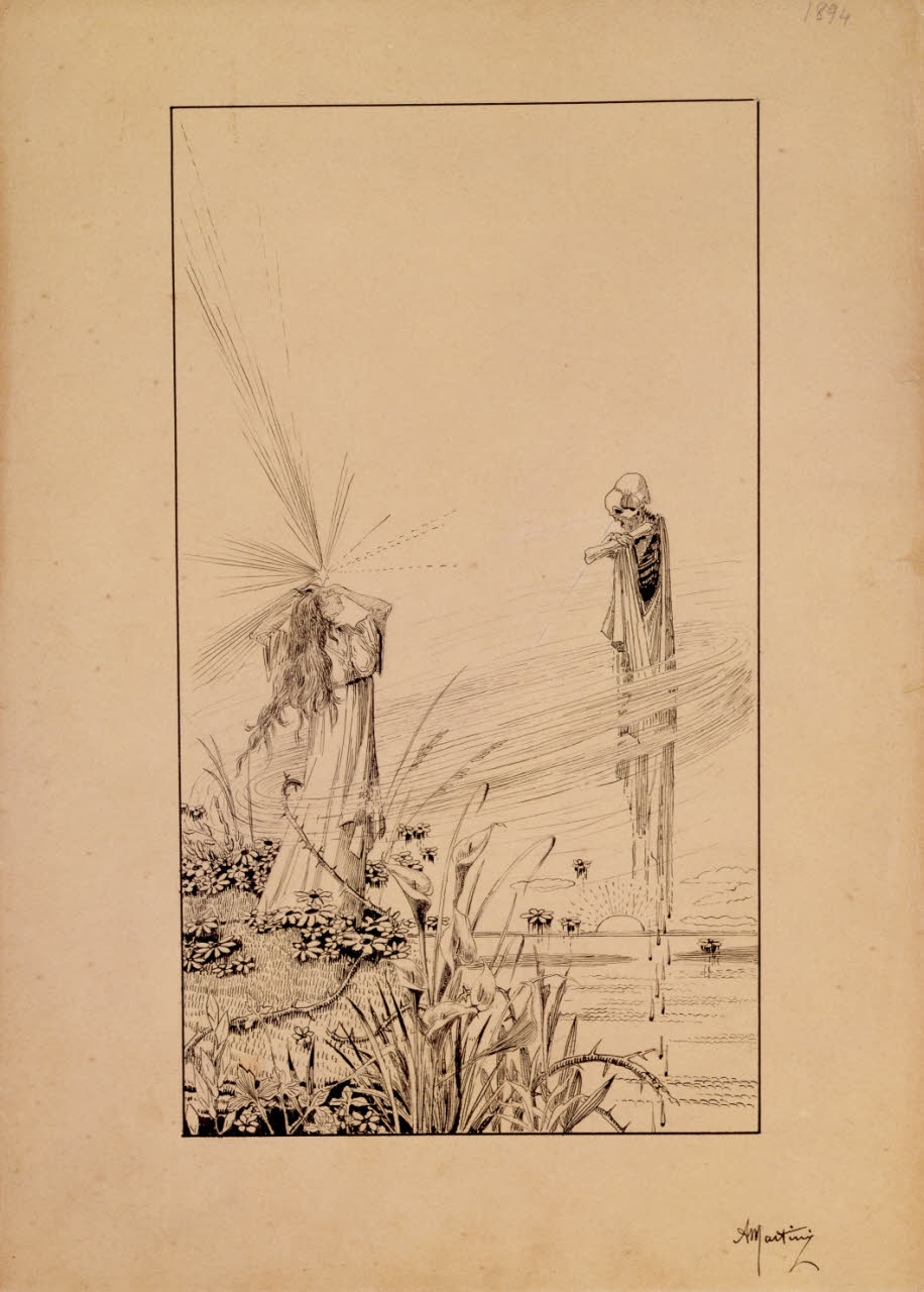 - NOTIZIE STORICO CRITICHE Come ricordato da Mercedes Garberi fu grazie alla segnalazione di Emilio Bertonati che, nel 1981, le collezioni civiche del Castello Sforzesco ottennero, grazie a un acquisto presso la Galleria del Levante, i quattordici disegni a inchiostro di china e acquerello eseguiti da Alberto Martini intorno 1895, raffiguranti L'albo della morte, opere apripista della "accesa serie dei cicli senza legami con le fonti letterarie" (Garberi 1981). Questo ciclo giovanile, così come quello dei primi disegni della serie dedicata a La secchia rapita di Tassoni, dette inizio alla copiosa produzione di incisioni e illustrazioni realizzate dell'artista negli anni successivi, che ne fecero uno tra gli illustratori italiani maggiormente apprezzati in Italia e in Europa (Ivi.). La serie dell'Albo della morte, appartenuta inizialmente alla vedova dell'artista Maria Petringa, venne trasferita agli eredi, e in seguito alla Galleria del Levante di Milano che li espose per la prima volta in una mostra dedicata all'autore tra il 1978 e il 1979. Nei quattordici disegni è già rintracciabile un forte legame di Martini con la cultura decadente del suo tempo a cui si associano suggestioni cinquecentesche derivanti dalla grafica di Dürer, di Luca di Leida, Graf e Grien oltre che da significativi rimandi al simbolismo nordico moderno franco-belga e tedesco. Il frontespizio, così come l'intera serie, è caratterizzato da una grafica neo-gotica che si apre con l'invocazione oraziana Pallida mors aequo pulsat pede pauperum tabernas regumque turres, anticipando verbalmente quanto raffigurato nei fogli, in cui con fermezza si assiste alla rappresentazione della morte nella sua veste più scabrosa. Chiaro nell'intero ciclo è il rimando alle donne angeliche di Previati o ad alcune opere segantiniane come Cattive madri o L'angelo della vita, in cui l'eleganza delle figure femminili si scontra con la staticità della morte che rievoca, invece, i soggetti e le ambientazioni macabre di molte delle opere dell'artista belga Félicien Rops e dei tedeschi Max Klinger e Joseph Sattler.