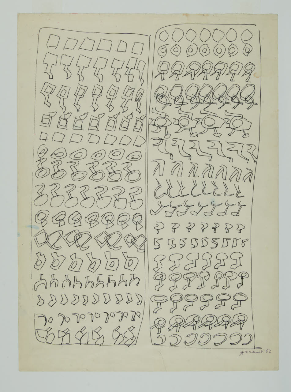- NOTIZIE STORICO CRITICHE Nel 1985 Carla Accardi dona alle raccolte pubbliche milanesi un nucleo di opere risalenti a un periodo compreso tra il 1954 e il 1962. Tra questi, oltre a "Frammento di Labirinto" (inv. 603) e "Senza titolo" (inv. 604) datati 1954 e caratterizzati da una fluttuazione di segni neri su fondo bianco, sono presenti altri tre disegni realizzati nel 1962. Due di questi, denominati rispettivamente "Senza titolo" (inv. 606) e "Pagina" (Inv. 607), sono creati dall'artista attraverso una struttura di segni che si ripetono, organizzati per file parallele. Come un nuovo linguaggio espressivo di comunicazione, all'interno di due quadrilateri tra di loro affiancati, tali forme sembrano evolversi da un'unica matrice semantica sfruttando strutture e dimensioni differenti. Senza mettere in discussione l'ordine compositivo delle forme, l'artista sviluppa in esse un leggero mutamento delle linee dal quale scaturisce un'illusione di dinamicità. Così come in questi fogli, nell'intera opera dell'Accardi il segno "da solo non vale per sé, ma esso esiste in rapporto ad altri segni dal momento che forma così come una struttura, e diventa espressione artistica (nella struttura) allorché porta (in una continuità compatta) il suo valore simbolico e individualistico, e perdendo ciò che ha di arbitrario acquista nel tutto un magico e intelligente significato di rigorosa necessità, ma insieme di gioco imprevedibile (ambiguo)" (C. Celant, Carla Accardi, Ranica 1999, p. XVIII).