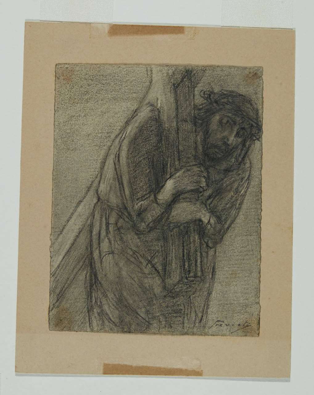 - NOTIZIE STORICO CRITICHE Della vasta produzione grafica di Gaetano Previati, si conservano all’interno del Civico Gabinetto di Disegni del Castello Sforzesco di Milano più di trecento opere su carta. Tra queste, acquistate nel 1983 dalla "Società per l’arte di Gaetano Previati" (società costituita nel 1911 con il fondo delle opere del maestro ferrarese raccolte da Grubicy), si registrano ventiquattro studi a carboncino realizzati tra l’autunno del 1901 e la primavera dell’anno successivo (inv-inv. agg. 632-655). Essi furono eseguiti dall’artista come studi preparatori per la messa in opera delle quattordici tele della "Via Crucis", oggi ai Musei Vaticani.\nSul tema della Passione di Cristo, Previati lavora a una serie di più varianti già dal 1882, quando esegue ad affresco le scene per il cimitero di Castano Primo (oggi staccati ed esposti al Museo Diocesano della città), e continua, negli anni successivi, realizzando ulteriori opere tratte dalle storie evangeliche. \nNino Barbantini, biografo di Previati, sottolinea come già dagli inizi degli anni ottanta dell’Ottocento, "le sue pitture e i suoi disegni che rappresentano i fatti della passione, formano un ciclo numeroso" e anche dopo la realizzazione degli affreschi di Castano, l’artista continua "operosissimamente a dedicare ad ogni singola stazione decine e decine di disegni [...]. Vedeva allora secondo delle composizioni tradizionali, un paese ampio, molta piccola gente, e in mezzo una piccola persona che era Gesù. Successivamente i disegni diventavano sempre più piccoli e le figure di Gesù diventavano sempre più grandi" (N. Barbantini, Gaetano Previati, Roma-Milano 1919, pp. 154-158). \nDa tale testimonianza si desumere che, seppur tra i disegni citati molteplici sono gli elementi comuni, altrettanto numerosi sono i fogli di articolata composizione spesso indipendenti dagli esiti pittorici. In alcuni esempi grafici si osservano composizioni ampie e descrittive, figure dispiegate in spazi ariosi con una sostanziale compattezza stilistica e tagli compositivi arditi. (cfr. Le opere di Gaetano Previati dell’associazione nazionale fra mutilati e invalidi di guerra, Milano 1927, tav. XXI-XXXVII; cfr. F. Bellozzi, T. Fiori, Archivi del Divisionismo, Roma 1968).\nDiverso è, invece, il caso dei ventiquattro piccoli fogli del Castello; in questi ultimi, infatti, si riscontrano chiare analogie iconografiche con le quattordici tele eseguite nei primi anni del Novecento.\nSecondo quanto sostenuto da Gianfranco Bruno, in occasione dalla loro prima esposizione nel 1983, questi fogli sono stati realizzati contemporaneamente alla serie pittorica, se non addirittura subito dopo "come piccolo ciclo destinato alla diffusione da studio". È più probabile però, vista anche la presenza di diverse varianti per alcune delle stazioni rappresentate, che i piccoli disegni abbiano accompagnato tutta la fatica di Previati per l’esecuzione delle opere, e che sia stato lo stesso Grubicy a decidere di raccogliere il meglio degli studi da taccuino, appositamente selezionati per la circolazione (Bruno 1983). \nNei ventiquattro fogli del Castello, l’artista è riuscito a comunicare un’intensità espressiva raramente raggiunta nelle sue opere pittoriche di soggetto religioso. Egli, infatti, in queste immagini raggiunge livelli di struggente e inusuale sensualità mistica. Le figure sono descritte attraverso una naturalezza degli atteggiamenti, entro i confini di uno spazio minimo e con una riduzione prospetticamente della scena che fa posto al Cristo o ai dolenti in primo piano. Inoltre, attraverso mutamenti di segno e chiaroscuro: "da un tratto violento, nervosamente sovrapposto a uno morbido e quasi dissolto in uno sfumato pulviscolare" (Fergonzi 1999), Previati riesce magistralmente a eludere i contorni e a immergere le figure in un chiaroscuro quasi trascendentale.