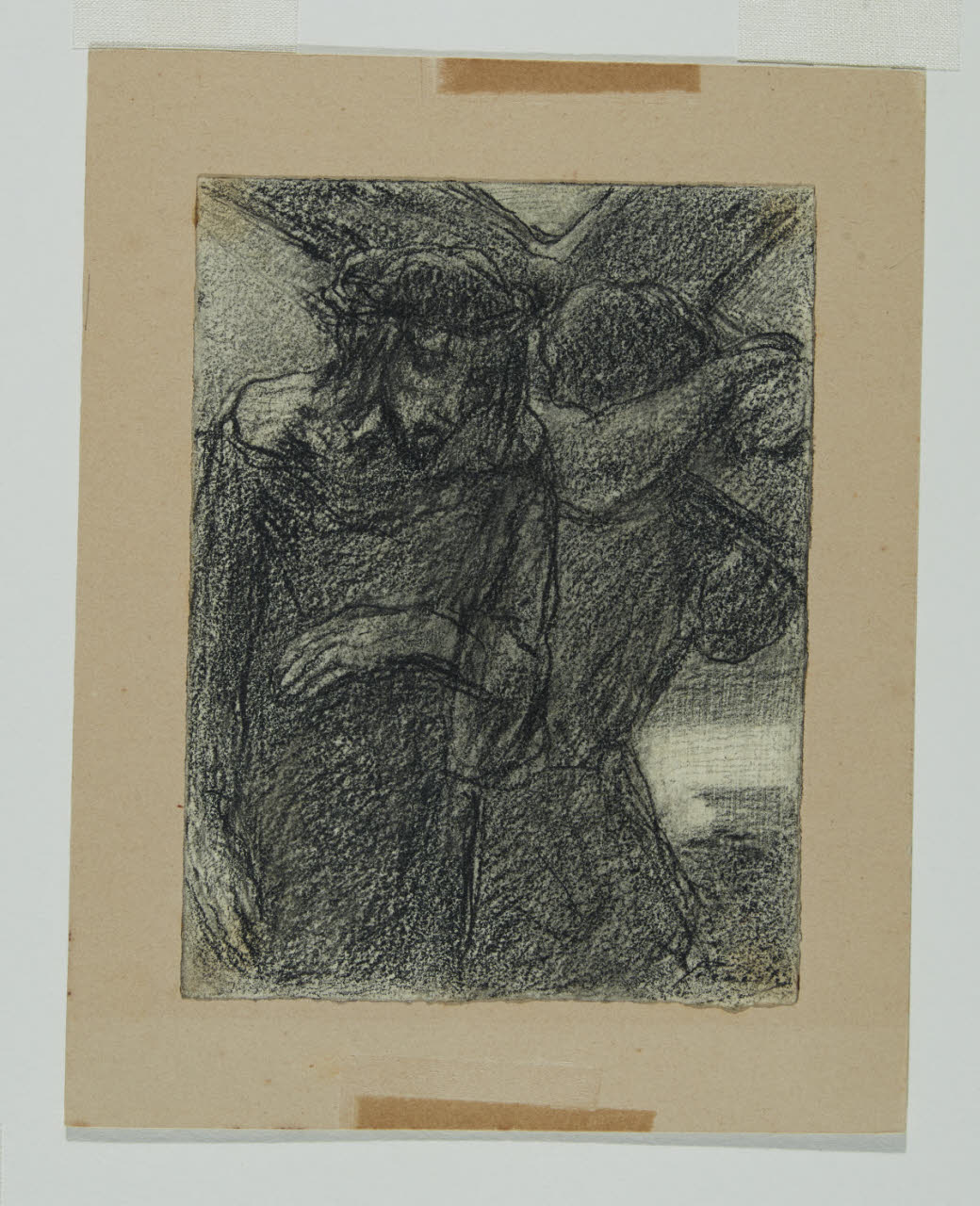 - NOTIZIE STORICO CRITICHE Della vasta produzione grafica di Gaetano Previati, si conservano all’interno del Civico Gabinetto di Disegni del Castello Sforzesco di Milano più di trecento opere su carta. Tra queste, acquistate nel 1983 dalla "Società per l’arte di Gaetano Previati" (società costituita nel 1911 con il fondo delle opere del maestro ferrarese raccolte da Grubicy), si registrano ventiquattro studi a carboncino realizzati tra l’autunno del 1901 e la primavera dell’anno successivo (inv-inv. agg. 632-655). Essi furono eseguiti dall’artista come studi preparatori per la messa in opera delle quattordici tele della "Via Crucis", oggi ai Musei Vaticani.\nSul tema della Passione di Cristo, Previati lavora a una serie di più varianti già dal 1882, quando esegue ad affresco le scene per il cimitero di Castano Primo (oggi staccati ed esposti al Museo Diocesano della città), e continua, negli anni successivi, realizzando ulteriori opere tratte dalle storie evangeliche. \nNino Barbantini, biografo di Previati, sottolinea come già dagli inizi degli anni ottanta dell’Ottocento, "le sue pitture e i suoi disegni che rappresentano i fatti della passione, formano un ciclo numeroso" e anche dopo la realizzazione degli affreschi di Castano, l’artista continua "operosissimamente a dedicare ad ogni singola stazione decine e decine di disegni [...]. Vedeva allora secondo delle composizioni tradizionali, un paese ampio, molta piccola gente, e in mezzo una piccola persona che era Gesù. Successivamente i disegni diventavano sempre più piccoli e le figure di Gesù diventavano sempre più grandi" (N. Barbantini, Gaetano Previati, Roma-Milano 1919, pp. 154-158). \nDa tale testimonianza si desumere che, seppur tra i disegni citati molteplici sono gli elementi comuni, altrettanto numerosi sono i fogli di articolata composizione spesso indipendenti dagli esiti pittorici. In alcuni esempi grafici si osservano composizioni ampie e descrittive, figure dispiegate in spazi ariosi con una sostanziale compattezza stilistica e tagli compositivi arditi. (cfr. Le opere di Gaetano Previati dell’associazione nazionale fra mutilati e invalidi di guerra, Milano 1927, tav. XXI-XXXVII; cfr. F. Bellozzi, T. Fiori, Archivi del Divisionismo, Roma 1968).\nDiverso è, invece, il caso dei ventiquattro piccoli fogli del Castello; in questi ultimi, infatti, si riscontrano chiare analogie iconografiche con le quattordici tele eseguite nei primi anni del Novecento.\nSecondo quanto sostenuto da Gianfranco Bruno, in occasione dalla loro prima esposizione nel 1983, questi fogli sono stati realizzati contemporaneamente alla serie pittorica, se non addirittura subito dopo "come piccolo ciclo destinato alla diffusione da studio". È più probabile però, vista anche la presenza di diverse varianti per alcune delle stazioni rappresentate, che i piccoli disegni abbiano accompagnato tutta la fatica di Previati per l’esecuzione delle opere, e che sia stato lo stesso Grubicy a decidere di raccogliere il meglio degli studi da taccuino, appositamente selezionati per la circolazione (Bruno 1983). \nNei ventiquattro fogli del Castello, l’artista è riuscito a comunicare un’intensità espressiva raramente raggiunta nelle sue opere pittoriche di soggetto religioso. Egli, infatti, in queste immagini raggiunge livelli di struggente e inusuale sensualità mistica. Le figure sono descritte attraverso una naturalezza degli atteggiamenti, entro i confini di uno spazio minimo e con una riduzione prospetticamente della scena che fa posto al Cristo o ai dolenti in primo piano. Inoltre, attraverso mutamenti di segno e chiaroscuro: "da un tratto violento, nervosamente sovrapposto a uno morbido e quasi dissolto in uno sfumato pulviscolare" (Fergonzi 1999), Previati riesce magistralmente a eludere i contorni e a immergere le figure in un chiaroscuro quasi trascendentale.