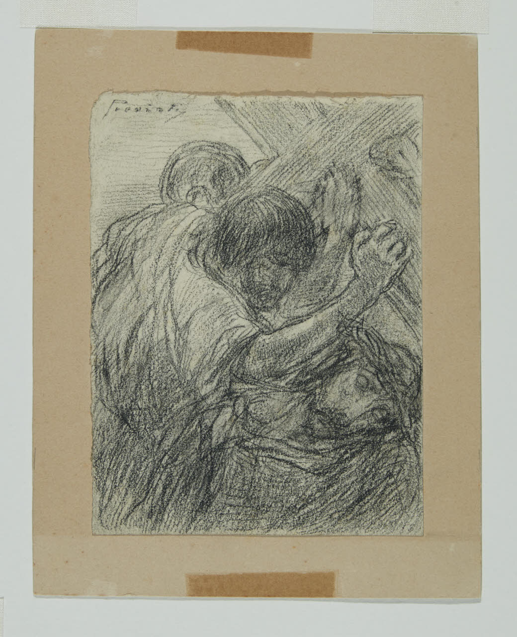 - NOTIZIE STORICO CRITICHE Della vasta produzione grafica di Gaetano Previati, si conservano all’interno del Civico Gabinetto di Disegni del Castello Sforzesco di Milano più di trecento opere su carta. Tra queste, acquistate nel 1983 dalla "Società per l’arte di Gaetano Previati" (società costituita nel 1911 con il fondo delle opere del maestro ferrarese raccolte da Grubicy), si registrano ventiquattro studi a carboncino realizzati tra l’autunno del 1901 e la primavera dell’anno successivo (inv-inv. agg. 632-655). Essi furono eseguiti dall’artista come studi preparatori per la messa in opera delle quattordici tele della "Via Crucis", oggi ai Musei Vaticani.\nSul tema della Passione di Cristo, Previati lavora a una serie di più varianti già dal 1882, quando esegue ad affresco le scene per il cimitero di Castano Primo (oggi staccati ed esposti al Museo Diocesano della città), e continua, negli anni successivi, realizzando ulteriori opere tratte dalle storie evangeliche. \nNino Barbantini, biografo di Previati, sottolinea come già dagli inizi degli anni ottanta dell’Ottocento, "le sue pitture e i suoi disegni che rappresentano i fatti della passione, formano un ciclo numeroso" e anche dopo la realizzazione degli affreschi di Castano, l’artista continua "operosissimamente a dedicare ad ogni singola stazione decine e decine di disegni [...]. Vedeva allora secondo delle composizioni tradizionali, un paese ampio, molta piccola gente, e in mezzo una piccola persona che era Gesù. Successivamente i disegni diventavano sempre più piccoli e le figure di Gesù diventavano sempre più grandi" (N. Barbantini, Gaetano Previati, Roma-Milano 1919, pp. 154-158). \nDa tale testimonianza si desumere che, seppur tra i disegni citati molteplici sono gli elementi comuni, altrettanto numerosi sono i fogli di articolata composizione spesso indipendenti dagli esiti pittorici. In alcuni esempi grafici si osservano composizioni ampie e descrittive, figure dispiegate in spazi ariosi con una sostanziale compattezza stilistica e tagli compositivi arditi. (cfr. Le opere di Gaetano Previati dell’associazione nazionale fra mutilati e invalidi di guerra, Milano 1927, tav. XXI-XXXVII; cfr. F. Bellozzi, T. Fiori, Archivi del Divisionismo, Roma 1968).\nDiverso è, invece, il caso dei ventiquattro piccoli fogli del Castello; in questi ultimi, infatti, si riscontrano chiare analogie iconografiche con le quattordici tele eseguite nei primi anni del Novecento.\nSecondo quanto sostenuto da Gianfranco Bruno, in occasione dalla loro prima esposizione nel 1983, questi fogli sono stati realizzati contemporaneamente alla serie pittorica, se non addirittura subito dopo "come piccolo ciclo destinato alla diffusione da studio". È più probabile però, vista anche la presenza di diverse varianti per alcune delle stazioni rappresentate, che i piccoli disegni abbiano accompagnato tutta la fatica di Previati per l’esecuzione delle opere, e che sia stato lo stesso Grubicy a decidere di raccogliere il meglio degli studi da taccuino, appositamente selezionati per la circolazione (Bruno 1983). \nNei ventiquattro fogli del Castello, l’artista è riuscito a comunicare un’intensità espressiva raramente raggiunta nelle sue opere pittoriche di soggetto religioso. Egli, infatti, in queste immagini raggiunge livelli di struggente e inusuale sensualità mistica. Le figure sono descritte attraverso una naturalezza degli atteggiamenti, entro i confini di uno spazio minimo e con una riduzione prospetticamente della scena che fa posto al Cristo o ai dolenti in primo piano. Inoltre, attraverso mutamenti di segno e chiaroscuro: "da un tratto violento, nervosamente sovrapposto a uno morbido e quasi dissolto in uno sfumato pulviscolare" (Fergonzi 1999), Previati riesce magistralmente a eludere i contorni e a immergere le figure in un chiaroscuro quasi trascendentale.