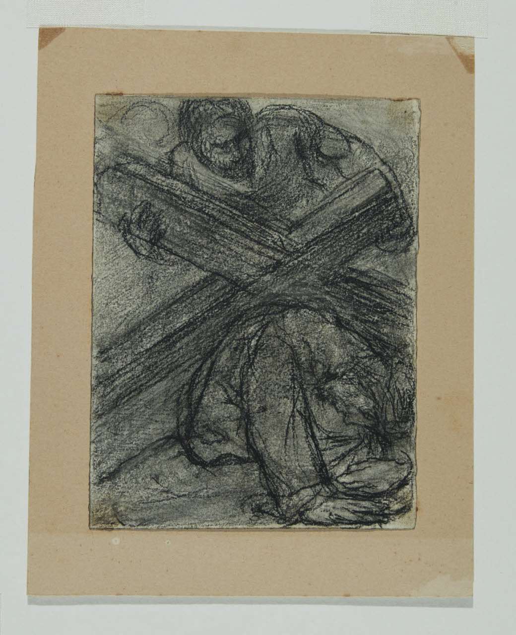 - NOTIZIE STORICO CRITICHE Della vasta produzione grafica di Gaetano Previati, si conservano all’interno del Civico Gabinetto di Disegni del Castello Sforzesco di Milano più di trecento opere su carta. Tra queste, acquistate nel 1983 dalla "Società per l’arte di Gaetano Previati" (società costituita nel 1911 con il fondo delle opere del maestro ferrarese raccolte da Grubicy), si registrano ventiquattro studi a carboncino realizzati tra l’autunno del 1901 e la primavera dell’anno successivo (inv-inv. agg. 632-655). Essi furono eseguiti dall’artista come studi preparatori per la messa in opera delle quattordici tele della "Via Crucis", oggi ai Musei Vaticani.\nSul tema della Passione di Cristo, Previati lavora a una serie di più varianti già dal 1882, quando esegue ad affresco le scene per il cimitero di Castano Primo (oggi staccati ed esposti al Museo Diocesano della città), e continua, negli anni successivi, realizzando ulteriori opere tratte dalle storie evangeliche. \nNino Barbantini, biografo di Previati, sottolinea come già dagli inizi degli anni ottanta dell’Ottocento, "le sue pitture e i suoi disegni che rappresentano i fatti della passione, formano un ciclo numeroso" e anche dopo la realizzazione degli affreschi di Castano, l’artista continua "operosissimamente a dedicare ad ogni singola stazione decine e decine di disegni [...]. Vedeva allora secondo delle composizioni tradizionali, un paese ampio, molta piccola gente, e in mezzo una piccola persona che era Gesù. Successivamente i disegni diventavano sempre più piccoli e le figure di Gesù diventavano sempre più grandi" (N. Barbantini, Gaetano Previati, Roma-Milano 1919, pp. 154-158). \nDa tale testimonianza si desumere che, seppur tra i disegni citati molteplici sono gli elementi comuni, altrettanto numerosi sono i fogli di articolata composizione spesso indipendenti dagli esiti pittorici. In alcuni esempi grafici si osservano composizioni ampie e descrittive, figure dispiegate in spazi ariosi con una sostanziale compattezza stilistica e tagli compositivi arditi. (cfr. Le opere di Gaetano Previati dell’associazione nazionale fra mutilati e invalidi di guerra, Milano 1927, tav. XXI-XXXVII; cfr. F. Bellozzi, T. Fiori, Archivi del Divisionismo, Roma 1968).\nDiverso è, invece, il caso dei ventiquattro piccoli fogli del Castello; in questi ultimi, infatti, si riscontrano chiare analogie iconografiche con le quattordici tele eseguite nei primi anni del Novecento.\nSecondo quanto sostenuto da Gianfranco Bruno, in occasione dalla loro prima esposizione nel 1983, questi fogli sono stati realizzati contemporaneamente alla serie pittorica, se non addirittura subito dopo "come piccolo ciclo destinato alla diffusione da studio". È più probabile però, vista anche la presenza di diverse varianti per alcune delle stazioni rappresentate, che i piccoli disegni abbiano accompagnato tutta la fatica di Previati per l’esecuzione delle opere, e che sia stato lo stesso Grubicy a decidere di raccogliere il meglio degli studi da taccuino, appositamente selezionati per la circolazione (Bruno 1983). \nNei ventiquattro fogli del Castello, l’artista è riuscito a comunicare un’intensità espressiva raramente raggiunta nelle sue opere pittoriche di soggetto religioso. Egli, infatti, in queste immagini raggiunge livelli di struggente e inusuale sensualità mistica. Le figure sono descritte attraverso una naturalezza degli atteggiamenti, entro i confini di uno spazio minimo e con una riduzione prospetticamente della scena che fa posto al Cristo o ai dolenti in primo piano. Inoltre, attraverso mutamenti di segno e chiaroscuro: "da un tratto violento, nervosamente sovrapposto a uno morbido e quasi dissolto in uno sfumato pulviscolare" (Fergonzi 1999), Previati riesce magistralmente a eludere i contorni e a immergere le figure in un chiaroscuro quasi trascendentale.