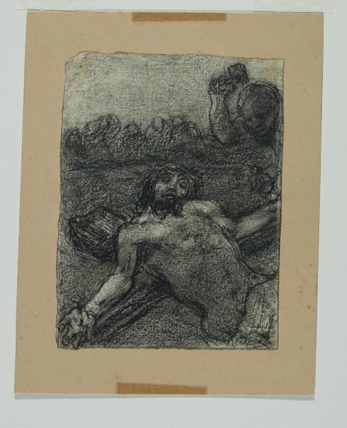 - NOTIZIE STORICO CRITICHE Della vasta produzione grafica di Gaetano Previati, si conservano all’interno del Civico Gabinetto di Disegni del Castello Sforzesco di Milano più di trecento opere su carta. Tra queste, acquistate nel 1983 dalla "Società per l’arte di Gaetano Previati" (società costituita nel 1911 con il fondo delle opere del maestro ferrarese raccolte da Grubicy), si registrano ventiquattro studi a carboncino realizzati tra l’autunno del 1901 e la primavera dell’anno successivo (inv-inv. agg. 632-655). Essi furono eseguiti dall’artista come studi preparatori per la messa in opera delle quattordici tele della "Via Crucis", oggi ai Musei Vaticani.\nSul tema della Passione di Cristo, Previati lavora a una serie di più varianti già dal 1882, quando esegue ad affresco le scene per il cimitero di Castano Primo (oggi staccati ed esposti al Museo Diocesano della città), e continua, negli anni successivi, realizzando ulteriori opere tratte dalle storie evangeliche. \nNino Barbantini, biografo di Previati, sottolinea come già dagli inizi degli anni ottanta dell’Ottocento, "le sue pitture e i suoi disegni che rappresentano i fatti della passione, formano un ciclo numeroso" e anche dopo la realizzazione degli affreschi di Castano, l’artista continua "operosissimamente a dedicare ad ogni singola stazione decine e decine di disegni [...]. Vedeva allora secondo delle composizioni tradizionali, un paese ampio, molta piccola gente, e in mezzo una piccola persona che era Gesù. Successivamente i disegni diventavano sempre più piccoli e le figure di Gesù diventavano sempre più grandi" (N. Barbantini, Gaetano Previati, Roma-Milano 1919, pp. 154-158). \nDa tale testimonianza si desumere che, seppur tra i disegni citati molteplici sono gli elementi comuni, altrettanto numerosi sono i fogli di articolata composizione spesso indipendenti dagli esiti pittorici. In alcuni esempi grafici si osservano composizioni ampie e descrittive, figure dispiegate in spazi ariosi con una sostanziale compattezza stilistica e tagli compositivi arditi. (cfr. Le opere di Gaetano Previati dell’associazione nazionale fra mutilati e invalidi di guerra, Milano 1927, tav. XXI-XXXVII; cfr. F. Bellozzi, T. Fiori, Archivi del Divisionismo, Roma 1968).\nDiverso è, invece, il caso dei ventiquattro piccoli fogli del Castello; in questi ultimi, infatti, si riscontrano chiare analogie iconografiche con le quattordici tele eseguite nei primi anni del Novecento.\nSecondo quanto sostenuto da Gianfranco Bruno, in occasione dalla loro prima esposizione nel 1983, questi fogli sono stati realizzati contemporaneamente alla serie pittorica, se non addirittura subito dopo "come piccolo ciclo destinato alla diffusione da studio". È più probabile però, vista anche la presenza di diverse varianti per alcune delle stazioni rappresentate, che i piccoli disegni abbiano accompagnato tutta la fatica di Previati per l’esecuzione delle opere, e che sia stato lo stesso Grubicy a decidere di raccogliere il meglio degli studi da taccuino, appositamente selezionati per la circolazione (Bruno 1983). \nNei ventiquattro fogli del Castello, l’artista è riuscito a comunicare un’intensità espressiva raramente raggiunta nelle sue opere pittoriche di soggetto religioso. Egli, infatti, in queste immagini raggiunge livelli di struggente e inusuale sensualità mistica. Le figure sono descritte attraverso una naturalezza degli atteggiamenti, entro i confini di uno spazio minimo e con una riduzione prospetticamente della scena che fa posto al Cristo o ai dolenti in primo piano. Inoltre, attraverso mutamenti di segno e chiaroscuro: "da un tratto violento, nervosamente sovrapposto a uno morbido e quasi dissolto in uno sfumato pulviscolare" (Fergonzi 1999), Previati riesce magistralmente a eludere i contorni e a immergere le figure in un chiaroscuro quasi trascendentale.