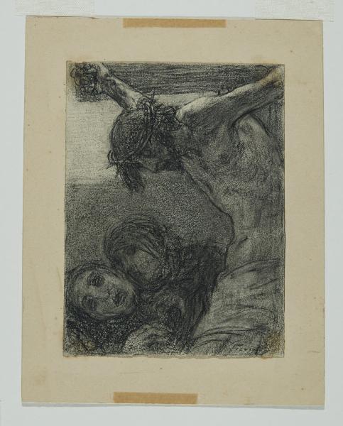 - NOTIZIE STORICO CRITICHE Della vasta produzione grafica di Gaetano Previati, si conservano all’interno del Civico Gabinetto di Disegni del Castello Sforzesco di Milano più di trecento opere su carta. Tra queste, acquistate nel 1983 dalla "Società per l’arte di Gaetano Previati" (società costituita nel 1911 con il fondo delle opere del maestro ferrarese raccolte da Grubicy), si registrano ventiquattro studi a carboncino realizzati tra l’autunno del 1901 e la primavera dell’anno successivo (inv-inv. agg. 632-655). Essi furono eseguiti dall’artista come studi preparatori per la messa in opera delle quattordici tele della "Via Crucis", oggi ai Musei Vaticani.\nSul tema della Passione di Cristo, Previati lavora a una serie di più varianti già dal 1882, quando esegue ad affresco le scene per il cimitero di Castano Primo (oggi staccati ed esposti al Museo Diocesano della città), e continua, negli anni successivi, realizzando ulteriori opere tratte dalle storie evangeliche. \nNino Barbantini, biografo di Previati, sottolinea come già dagli inizi degli anni ottanta dell’Ottocento, "le sue pitture e i suoi disegni che rappresentano i fatti della passione, formano un ciclo numeroso" e anche dopo la realizzazione degli affreschi di Castano, l’artista continua "operosissimamente a dedicare ad ogni singola stazione decine e decine di disegni [...]. Vedeva allora secondo delle composizioni tradizionali, un paese ampio, molta piccola gente, e in mezzo una piccola persona che era Gesù. Successivamente i disegni diventavano sempre più piccoli e le figure di Gesù diventavano sempre più grandi" (N. Barbantini, Gaetano Previati, Roma-Milano 1919, pp. 154-158). \nDa tale testimonianza si desumere che, seppur tra i disegni citati molteplici sono gli elementi comuni, altrettanto numerosi sono i fogli di articolata composizione spesso indipendenti dagli esiti pittorici. In alcuni esempi grafici si osservano composizioni ampie e descrittive, figure dispiegate in spazi ariosi con una sostanziale compattezza stilistica e tagli compositivi arditi. (cfr. Le opere di Gaetano Previati dell’associazione nazionale fra mutilati e invalidi di guerra, Milano 1927, tav. XXI-XXXVII; cfr. F. Bellozzi, T. Fiori, Archivi del Divisionismo, Roma 1968).\nDiverso è, invece, il caso dei ventiquattro piccoli fogli del Castello; in questi ultimi, infatti, si riscontrano chiare analogie iconografiche con le quattordici tele eseguite nei primi anni del Novecento.\nSecondo quanto sostenuto da Gianfranco Bruno, in occasione dalla loro prima esposizione nel 1983, questi fogli sono stati realizzati contemporaneamente alla serie pittorica, se non addirittura subito dopo "come piccolo ciclo destinato alla diffusione da studio". È più probabile però, vista anche la presenza di diverse varianti per alcune delle stazioni rappresentate, che i piccoli disegni abbiano accompagnato tutta la fatica di Previati per l’esecuzione delle opere, e che sia stato lo stesso Grubicy a decidere di raccogliere il meglio degli studi da taccuino, appositamente selezionati per la circolazione (Bruno 1983). \nNei ventiquattro fogli del Castello, l’artista è riuscito a comunicare un’intensità espressiva raramente raggiunta nelle sue opere pittoriche di soggetto religioso. Egli, infatti, in queste immagini raggiunge livelli di struggente e inusuale sensualità mistica. Le figure sono descritte attraverso una naturalezza degli atteggiamenti, entro i confini di uno spazio minimo e con una riduzione prospetticamente della scena che fa posto al Cristo o ai dolenti in primo piano. Inoltre, attraverso mutamenti di segno e chiaroscuro: "da un tratto violento, nervosamente sovrapposto a uno morbido e quasi dissolto in uno sfumato pulviscolare" (Fergonzi 1999), Previati riesce magistralmente a eludere i contorni e a immergere le figure in un chiaroscuro quasi trascendentale.