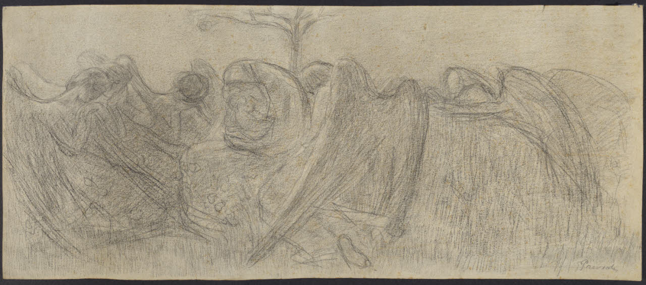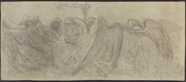 - NOTIZIE STORICO CRITICHE Numerosi dovettero essere i fogli preparatori eseguiti da Gaetano Previati per quella che fu una delle opere più importanti della sua produzione artistica divisionista: la Maternità, dipinto eseguito dopo una febbrile gestazione intorno al 1891, e presentato nello stesso anno alla prima Esposizione Triennale di Milano. Il quadro, acquistato successivamente dal conte Lionello Hierschel de Minerbi dalla Galleria di Alberto Grubicy per la sua nuova dimora veneziana di Palazzo Rezzonico, dal 1923 entra a far parte delle collezioni della Banca Popolare di Novara. Tra i numerosi schizzi realizzati per quest'opera, che circolarono tra gli ambienti collezionistici già dagli inizi del Novecento, e ampiamente studiati da Francesca Rossi (Rossi 2015; Rossi 2017), grande rilevanza ha quello acquistato recentemente a Milano dalla galleria La Portantina di Mattia Jona per le raccolte del Civico Gabinetto di Disegni del Castello Sforzesco e da considerare uno degli ultimi bozzetti realizzati dall'artista ferrarese.\nIl foglio in questione rispecchia l'idea definitiva del dipinto, con l'aggiunta di minime disuguaglianze assenti in quest'ultimo, come alcuni fiori tra l'erba sul lato destro della composizione. Vi si ritrovano inoltre elementi stilistici mutuati dall'opera dei Primitivi, in particolare di Botticelli, e dei Preraffaelliti inglesi da cui l'artista ricava le meravigliose creature angeliche dalle grandi ali spiegate che riempiono la scena.\nDa segnalare è quanto messo in evidenza da Francesca Rossi in merito alla tecnica disegnativa: "il tratto sintetico e il chiaroscuro polveroso e rarefatto rivelano che la ricerca degli effetti luministici è ancora in atto"; l'effetto di luce intorno alle tre figure centrali è il risultato del contrasto che deriva dall'assenza di acquerellatura in questa zona del disegno, che caratterizza invece il resto della superficie del foglio; una tinteggiatura molto diluita del carboncino (Rossi 2015). Le linee veloci di carboncino che risaltano sul foglio chiaro ottenute mediante differenti livelli di pressione, e il dinamismo di un segno grafico delicato, sintetico e vibrante, si uniscono in un vigoroso e vivace chiaroscuro. La dirompente libertà espressiva manifestata in questo studio, come in altri schizzi preparatori per il dipinto della Maternità, "supera in un nuovo linearismo la tradizione del disegno accademico e dimostra che l'artista ha già varcato la soglia dell'arte moderna ed è alle prese con un originale linguaggio che diventerà un punto di riferimento imprescindibile per gli artisti dell'avanguardia delle generazione successiva" (Ivi). Infine, è importante segnalare, oltre a questo schizzo preparatorio, la realizzazione di alcuni disegni raffiguranti il dipinto e realizzati successivamente. Questi furono commissionati da Grubicy, in mancanza dell'opera originale ormai in collezione privata, per essere esposti in diverse occasioni dedicate all'artista in Italia e all'estero. Uno, oggi disperso, è quello presentato all'Esposizione di duecento opere di Gaetano Previati nel 1910 a Palazzo della Permanente, la cui storia è stata ricostruita fino al 1917 (Ivi), e a cui è adesso possibile aggiungere un altro piccolo tassello, in quanto trattasi del disegno a matita (940 x 400 mm) presentato all'asta della raccolta degli eredi Benzoni nel 1932 (Raccolta Eredi Benzoni, Milano 1932, n. 131, tav. XXXIX) e venduto in quella occasione.