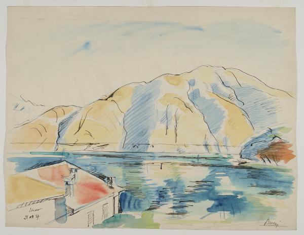 - NOTIZIE STORICO CRITICHE Dalla fine degli anni Venti, Anselmo Bucci concentra la sua attenzione anche al genere del paesaggio con una serie di vedute che, oltre a celebrare la nuova cultura urbana e periferica, si spingevano verso nuovi orizzonti e valori formali. Ne sono un esempio i due fogli raffiguranti il paesaggio del lago di Como (invv. 1314/2 E 17/2, 1314/3 E 17/3), da datare all’ottobre del 1927. Lontani dalla poetiche di Novecento, nei due disegni l’artista, attraverso veloci tratti di inchiostro e intense pennellate di acquerello, descrive le sponde del lago e i monti che lo circondano. Inoltre, in uno di essi, inserisce, separatamente dalla composizione principale, una mescolanza di fiori dalla forte vivacità cromatica. Nei due fogli Bucci, dilatando il paesaggio verso l’orizzonte, mostra lo spettacolo della natura, ques’ultimo divenuto protagoniasta assoluto della scena. I due disegni furono donati alla raccolta dalla "Società Artistica degli Indipendenti" - di cui l’artista fu uno dei fondatori - come compenso per l’ospitalità ricevuta in occasione della "Prima mostra di Pittura e Scultura" organizzata all’interno del Castello Sforzesco nel 1945. In quella occasione Bucci espose il "Funerale dell’Anarchico", mentre non risultano in catalogo i due fogli sopra descritti.