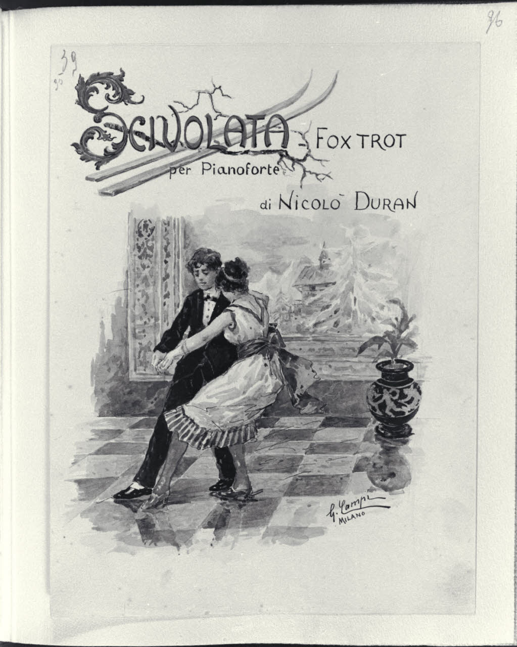 - NOTIZIE STORICO CRITICHE L’album inv. L B 15 del Civico Gabinetto dei Disegni del Castello Sforzesco, raccoglie una serie di illustrazioni realizzate da Giacomo Campi (1846 - 1921). Donato al Comune di Milano da Luigi Donnini nel 1937, è composto da 61 fogli montati su 63 pagine di carta color avorio dove su ognuna di esse è indicato a matita il corrispettivo numero progressivo dei diversi fogli. I disegni, tutti firmati"Giacomo Campi. Milano", sono stati realizzati come frontespizi di spettacoli musicali, canzoni e ballate composte da Nicolò Duran; i versi di alcune di queste composizioni sono invece di U. Barbieri, E. Boccola, F. Cavallotti, G. E. Ducati, G. Giacchi, R. Paravicini, L. Stecchetti, Q. Vivanti, J. Well. Tali opere grafiche, molte delle quali quadrettate a matita, sono realizzate con rapidi e veloci tratti di inchiostro nero e acquerelli colorati dalle vivaci e cangianti cromie. Su ogni foglio, nella parte superiore al centro, campeggia il titolo della composizione descritta con caratteri stilizzati, arabeschi vegetali e capilettera figurali. Le scene rappresentate hanno spesso ambientazioni che evocano il genere musicale e rimandano a un tipico gusto Liberty, che si trasforma in motivi rococò o neoclassici. Nelle diverse composizioni si osservano principalmente soggetti e figure di giovani innamorati che danzano, si guardano o assumono atteggiamenti e pose romantiche in ambienti bucolici o all’interno di ricche dimore. Difficile risulta, a oggi, stabilire una data certa per la loro esecuzione, ma è molto probabile che siano state realizzate in un lasso di tempo abbastanza ampio e verosimilmente dopo il 1871, anno in cui l’artista prese fissa dimora a Milano. Il pittore, prima di tale data, aveva infatti frequentato l’Accademia Carrara di Bergamo e successivamente l’Accademia di S. Luca a Roma. Nella Milano di fine Ottocento acquistò subito grande popolarità, prese attivamente parte a tutte le manifestazioni della "Scapigliatura" lombarda e si distinse come pittore di affreschi, scene di genere e acquafortista, oltre che come inconfondibile acquerellista.