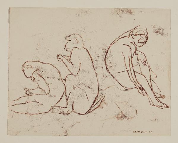 - NOTIZIE STORICO CRITICHE Nel dicembre del 1932 Capogrossi espone, con Cagli e Cavalli, alla Galleria di Roma di Baldi e nuovamente insieme saranno presenti dal 21 febbraio 1933, all'interno della Galleria del Milione. Dei tre giovani pittori romani e della loro mostra, ne da notizia il Bollettino numero 9 della Galleria, insieme ad altri quotidiani locali (Vilardi 2001-2002). In quella occasione le raccolte pubbliche della città lombarda acquistano un foglio intitolato "Scimmie", realizzato con la tecnica del monotipo a olio. Il procedimento di questa tecnica è attuato tracciando le linee, che definiscono le figure, attraverso uno strumento appuntito sul verso del foglio; questo a sua volta è poggiato su una matrice preparata a olio che, grazie alla pressione effettuata dall'attrezzo, imprime il colore sul recto della pagina lasciando una linea dal segno nitido e sintetico. Sul foglio, infatti, si osservano chiaramente le tracce brune lasciate della matrice e sul verso, oltre la traccia della punta d'argento, è presente anche il disegno a matita, servito in questo caso come traccia preliminare per l'incisione vera e propria, se pur in realtà non corrisponde perfettamente al segno inciso, ma vi sono delle modifiche fra l'idea inizia e l'opera finita. Dunque per ricerca e tecnica, il disegno appartiene alle prime sperimentazioni condotte dall'artista e, come osservato dalla critica, il soggetto si può ricollegare agli animali ritratti dal vivo dall'artista all'interno dello zoo di Roma e riconducibili a loro volta alla "I Mostra degli animali nell'arte" nel 1930 (cfr. B. Mantura, Capogrossi fino al 1948, Roma/Milano 1986, nn. 69-72). Della produzione giovani di Capogrossi rimangono pochi esemplari, l'artista, infatti, alla fine della seconda Guerra Mondiale, revisionando il proprio genere stilistico, scelse di distruggere una buona parte di queste opere grafiche.