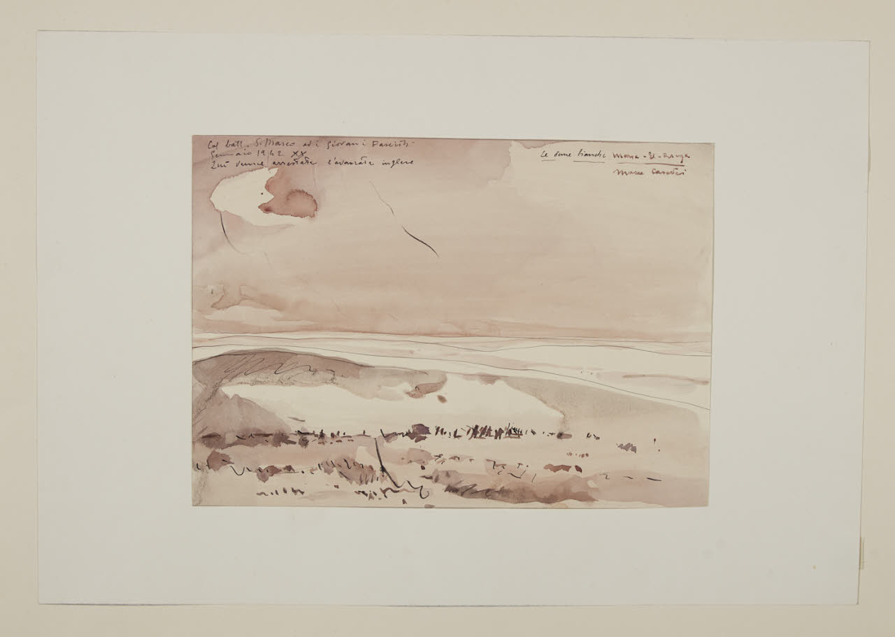 - NOTIZIE STORICO CRITICHE Quando nel 1940 l'Italia entrò in guerra a fianco della Germania, Maceo Casadei partì come volontario con il "reparto guerra", in qualità di pittore e fotoreporter per l'Istituto Nazionale Luce, con l'obbiettivo di documentare le operazioni belliche delle truppe italiane. Nelle sue memorie, scritte tra il 1950 e il 1960, l'artista forlivese racconta dettagliatamente tutti i momenti del conflitto a cui prese parte e offre un minuzioso resoconto della sua attività e dei suoi spostamenti. Delle sue esperienze si ha testimonianza nelle circa 6000 fotografie scattate e nelle oltre 400 "impressioni" realizzate in dipinti e disegni. Dopo alcune missioni nei mari italiani, e avendo girovagato in largo e in lungo per la penisola, nell'ottobre del 1941 Maceo si sposta in Africa settentrionale. Cosi scrive: "mi venne il desiderio di recarmi sui fronti in terra Africana, sicuro di poter raccogliere un maggior materiale di guerra, ed un diverso 'color locale' […] Dopo Tripoli, El Adem e Tobruk, ci dirigemmo a Bir-El-Gobi per riprendere le ultime fasi di una crudele battaglia" (A. Imbellone, Maceo: anni Romani, 1934-1944, Cinisello Balsamo 2008, p. 34). Nella primavera del 1942, dopo il passaggio da Dumini e Tauorga, Maceo chiese e ottenne il permesso di far ritorno a Roma, e tra il maggio e il giugno dello stesso anno allestisce alle Terme di Roma la sua prima personale di guerra, presentando una quarantina di opere. \nDal 30 settembre al 12 ottobre del 1942, invece, la Galleria milanese del Milione ospitò la seconda mostra di guerra di Maceo, questa volta formata da soli disegni e guazzi, per un totale di 32 fogli. Nel testo introduttivo alla mostra, firmato da Attilio Crespi, il critico sottolinea l'altissima capacità raggiunta dall'artista forlivese a far luce e inquadrare le scene, raccogliendo gesti e atteggiamenti attraverso una schietta emotività. Lo stesso Maceo ricorda nelle sue memorie manoscritte, il grande successo di critica e di pubblico ottenuto dalla mostra e la triste chiusura a causa del primo bombardamento aereo su Milano. Di questi disegni, secondo le parole dell'artista, 28 furono venduti: 8 acquistati da privati, 5 dal Museo del Rinascimento di Milano e la rimanenza dal comune del capoluogo lombardo e destinati alle Raccolte Bertarelli. A questi quindici fogli, oggi conservati all'interno del Civico Gabinetto di Disegni (invv. 1949/1 C 202/1 - 1949/15 C202/15), si è aggiunto un altro nucleo donato dal pittore intorno agli inizi degli anni Sessanta. Essi comprendono alcune opere eseguite come le precedenti durante la campagna in Africa (invv. Agg. 239; 70; 228; 229; 234), e altri disegni datati al 1918, al 1943 e al 1944 (invv. Agg. 68-71; 228-238).\nI disegni di guerra di Maceo Casadei realizzati tra il 1941 e il 1942 si distaccano, nella maggior parte dei casi, dal tipico filone documentario per un carattere di sintetica immediatezza e vibrazione lirica del colore. Il mutare rapido della scena costringe l'artista a immortalare il gemito della raffigurazione tramite tratti veloci di inchiostro di china e linee spezzate in supporti cartacei, alcuni dei quali di fortuna: pagine di protocollo stampato, fogli di taccuino o di diario. Così scrisse "fotografo e disegno scarabocchiando fogli su fogli di carta d'ogni tipo e colore" (Ivi). Attraverso il filtro del suo sguardo Maceo concentra il dramma della guerra in una rappresentazione piena di dinamicità, dove il dolore non è raffigurato attraverso le figure, che risultano schematiche e abbozzate, ma in una resa violenta del conflitto armato. Attraverso un tratto veloce e schizzato con variazioni delicate di colore diluito, la guerra è tratteggiata in lontananza con i soldati in corteo tra le sterminate dune del deserto o all'interno di buche scavate nella terra; tra i mari in mezzo agli scontri navali o nei campi di battaglia tra i carri armati. Oltre a ciò Casadei realizza alcuni splendidi paesaggi di deserto inserendo in alcuni casi non solo i cortei delle truppe militari, ma anche piccole figurine schizzate o accampamenti di beduini. Inoltre, con l'intento di offrire il ricordo di quei terribili ma avventurosi momenti, ogni foglio è contraddistinto, oltre che da data e firma, dalla presenza di note autografe con il quale l'artista regista le vicende che raffigura.