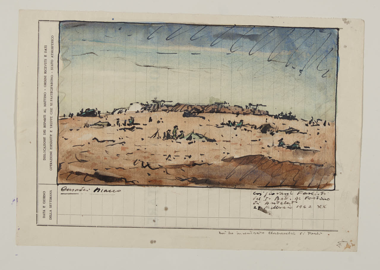 - NOTIZIE STORICO CRITICHE Quando nel 1940 l'Italia entrò in guerra a fianco della Germania, Maceo Casadei partì come volontario con il "reparto guerra", in qualità di pittore e fotoreporter per l'Istituto Nazionale Luce, con l'obbiettivo di documentare le operazioni belliche delle truppe italiane. Nelle sue memorie, scritte tra il 1950 e il 1960, l'artista forlivese racconta dettagliatamente tutti i momenti del conflitto a cui prese parte e offre un minuzioso resoconto della sua attività e dei suoi spostamenti. Delle sue esperienze si ha testimonianza nelle circa 6000 fotografie scattate e nelle oltre 400 "impressioni" realizzate in dipinti e disegni. Dopo alcune missioni nei mari italiani, e avendo girovagato in largo e in lungo per la penisola, nell'ottobre del 1941 Maceo si sposta in Africa settentrionale. Cosi scrive: "mi venne il desiderio di recarmi sui fronti in terra Africana, sicuro di poter raccogliere un maggior materiale di guerra, ed un diverso 'color locale' […] Dopo Tripoli, El Adem e Tobruk, ci dirigemmo a Bir-El-Gobi per riprendere le ultime fasi di una crudele battaglia" (A. Imbellone, Maceo: anni Romani, 1934-1944, Cinisello Balsamo 2008, p. 34). Nella primavera del 1942, dopo il passaggio da Dumini e Tauorga, Maceo chiese e ottenne il permesso di far ritorno a Roma, e tra il maggio e il giugno dello stesso anno allestisce alle Terme di Roma la sua prima personale di guerra, presentando una quarantina di opere. \nDal 30 settembre al 12 ottobre del 1942, invece, la Galleria milanese del Milione ospitò la seconda mostra di guerra di Maceo, questa volta formata da soli disegni e guazzi, per un totale di 32 fogli. Nel testo introduttivo alla mostra, firmato da Attilio Crespi, il critico sottolinea l'altissima capacità raggiunta dall'artista forlivese a far luce e inquadrare le scene, raccogliendo gesti e atteggiamenti attraverso una schietta emotività. Lo stesso Maceo ricorda nelle sue memorie manoscritte, il grande successo di critica e di pubblico ottenuto dalla mostra e la triste chiusura a causa del primo bombardamento aereo su Milano.Di questi disegni, secondo le parole dell'artista, ventotto furono venduti: 8 acquistati da privati, 5 dal Museo del Rinascimento di Milano e la rimanenza dal comune del capoluogo lombardo e destinati alle Raccolte Bertarelli. A questi 15 fogli, oggi conservati all'interno del Civico Gabinetto di Disegni (invv. 1949/1 C 202/1 - 1949/15 C 202/15), si è aggiunto un altro nucleo donato dal pittore intorno agli inizi degli anni Sessanta. Essi comprendono alcune opere eseguite come le precedenti durante la campagna in Africa (invv. Agg. 239; 70; 228; 229; 234), e altri disegni datati al 1918, al 1943 e al 1944 (invv. Agg. 68-71; 228-238). I disegni di guerra di Maceo Casadei realizzati tra il 1941 e il 1942 si distaccano, nella maggior parte dei casi, dal tipico filone documentario per un carattere di sintetica immediatezza e vibrazione lirica del colore. Il mutare rapido della scena costringe l'artista a immortalare il gemito della raffigurazione tramite tratti veloci di inchiostro di china e linee spezzate in supporti cartacei, alcuni dei quali di fortuna: pagine di protocollo stampato, fogli di taccuino o di diario. Così scrisse "fotografo e disegno scarabocchiando fogli su fogli di carta d'ogni tipo e colore" (Ivi). Attraverso il filtro del suo sguardo Maceo concentra il dramma della guerra in una rappresentazione piena di dinamicità, dove il dolore non è raffigurato attraverso le figure, che risultano schematiche e abbozzate, ma in una resa violenta del conflitto armato. Attraverso un tratto veloce e schizzato con variazioni delicate di colore diluito, la guerra è tratteggiata in lontananza con i soldati in corteo tra le sterminate dune del deserto o all'interno di buche scavate nella terra; tra i mari in mezzo agli scontri navali o nei campi di battaglia tra i carri armati. Oltre a ciò Casadei realizza alcuni splendidi paesaggi di deserto inserendo in alcuni casi non solo i cortei delle truppe militari, ma anche piccole figurine schizzate o accampamenti di beduini. Inoltre, con l'intento di offrire il ricordo di quei terribili ma avventurosi momenti, ogni foglio è contraddistinto, oltre che da data e firma, dalla presenza di note autografe con il quale l'artista regista le vicende che raffigura.