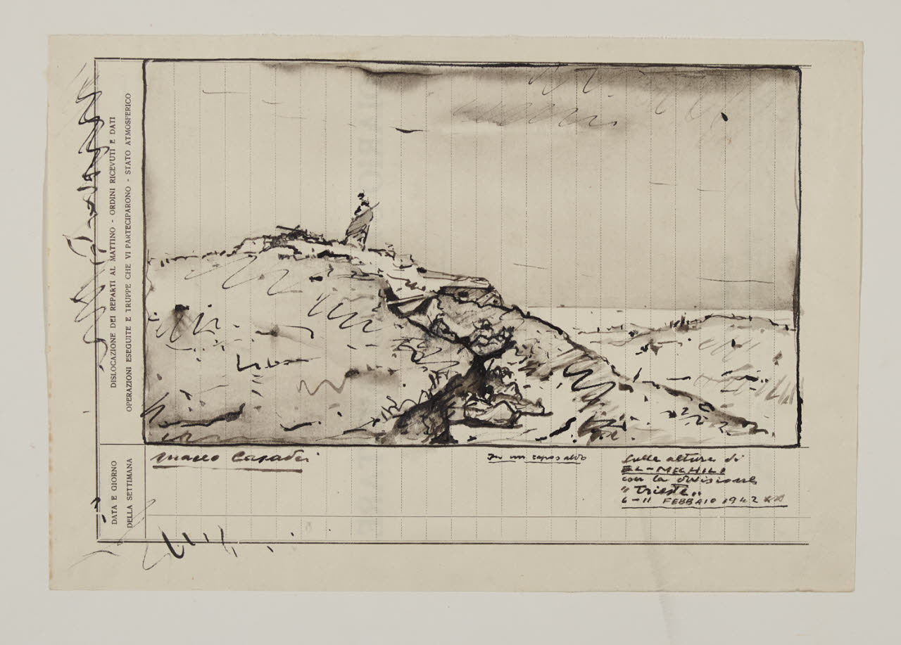 - NOTIZIE STORICO CRITICHE Quando nel 1940 l'Italia entrò in guerra a fianco della Germania, Maceo Casadei partì come volontario con il "reparto guerra", in qualità di pittore e fotoreporter per l'Istituto Nazionale Luce, con l'obbiettivo di documentare le operazioni belliche delle truppe italiane. Nelle sue memorie, scritte tra il 1950 e il 1960, l'artista forlivese racconta dettagliatamente tutti i momenti del conflitto a cui prese parte e offre un minuzioso resoconto della sua attività e dei suoi spostamenti. Delle sue esperienze si ha testimonianza nelle circa seimila fotografie scattate e nelle oltre quattrocento "impressioni" realizzate in dipinti e disegni. Dopo alcune missioni nei mari italiani, e avendo girovagato in largo e in lungo per la penisola, nell'ottobre del 1941 Maceo si sposta in Africa settentrionale. Cosi scrive: "mi venne il desiderio di recarmi sui fronti in terra Africana, sicuro di poter raccogliere un maggior materiale di guerra, ed un diverso 'color locale' […] Dopo Tripoli, El Adem e Tobruk, ci dirigemmo a Bir-El-Gobi per riprendere le ultime fasi di una crudele battaglia" (A. Imbellone, Maceo: anni Romani, 1934-1944, Cinisello Balsamo 2008, p. 34). Nella primavera del 1942, dopo il passaggio da Dumini e Tauorga, Maceo chiese e ottenne il permesso di far ritorno a Roma, e tra il maggio e il giugno dello stesso anno allestisce alle Terme di Roma la sua prima personale di guerra, presentando una quarantina di opere. \nDal 30 settembre al 12 ottobre del 1942, invece, la Galleria milanese del Milione ospitò la seconda mostra di guerra di Maceo, questa volta formata da soli disegni e guazzi, per un totale di trentadue fogli. Nel testo introduttivo alla mostra, firmato da Attilio Crespi, il critico sottolinea l'altissima capacità raggiunta dall'artista forlivese a far luce e inquadrare le scene, raccogliendo gesti e atteggiamenti attraverso una schietta emotività. Lo stesso Maceo ricorda nelle sue memorie manoscritte, il grande successo di critica e di pubblico ottenuto dalla mostra e la triste chiusura a causa del primo bombardamento aereo su Milano. Di questi disegni, secondo le parole dell'artista, ventotto furono venduti: otto acquistati da privati, cinque dal Museo del Rinascimento di Milano e la rimanenza dal comune del capoluogo lombardo e destinati alle Raccolte Bertarelli. A questi quindici fogli, oggi conservati all'interno del Civico Gabinetto di Disegni (invv. 1949/1 C 202/1 - 1949/15 C202/15), si è aggiunto un altro nucleo donato dal pittore intorno agli inizi degli anni Sessanta. Essi comprendono alcune opere eseguite come le precedenti durante la campagna in Africa (invv. Agg. 239; 70; 228; 229; 234), e altri disegni datati al 1918, al 1943 e al 1944 (invv. Agg. 68-71; 228-238). I disegni di guerra di Maceo Casadei realizzati tra il 1941 e il 1942 si distaccano, nella maggior parte dei casi, dal tipico filone documentario per un carattere di sintetica immediatezza e vibrazione lirica del colore. Il mutare rapido della scena costringe l'artista a immortalare il gemito della raffigurazione tramite tratti veloci di inchiostro di china e linee spezzate in supporti cartacei, alcuni dei quali di fortuna: pagine di protocollo stampato, fogli di taccuino o di diario. Così scrisse "fotografo e disegno scarabocchiando fogli su fogli di carta d'ogni tipo e colore" (Ivi). Attraverso il filtro del suo sguardo Maceo concentra il dramma della guerra in una rappresentazione piena di dinamicità, dove il dolore non è raffigurato attraverso le figure, che risultano schematiche e abbozzate, ma in una resa violenta del conflitto armato. Attraverso un tratto veloce e schizzato con variazioni delicate di colore diluito, la guerra è tratteggiata in lontananza con i soldati in corteo tra le sterminate dune del deserto o all'interno di buche scavate nella terra; tra i mari in mezzo agli scontri navali o nei campi di battaglia tra i carri armati. Oltre a ciò Casadei realizza alcuni splendidi paesaggi di deserto inserendo in alcuni casi non solo i cortei delle truppe militari, ma anche piccole figurine schizzate o accampamenti di beduini. Inoltre, con l'intento di offrire il ricordo di quei terribili ma avventurosi momenti, ogni foglio è contraddistinto, oltre che da data e firma, dalla presenza di note autografe con il quale l'artista regista le vicende che raffigura.