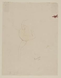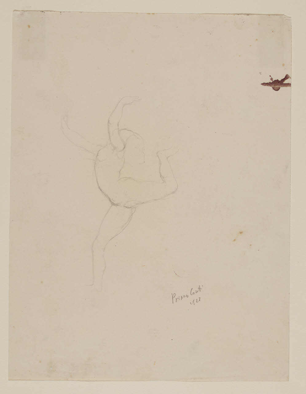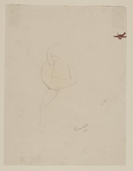 - NOTIZIE STORICO CRITICHE Nei piccoli schizzi e disegni e nei numerosi fogli di quaderno realizzati da Primo Conti, vi è testimonianza di quella personale ricerca espressiva caratterizzata dall'influenza di differenti mezzi espressivi tra cui la musica, il teatro, l'arte circense e la danza con cui l'artista venne a contatto. In quegli anni, infatti, l'artista frequentava costantemente l'ambiente cosmopolita urbano e in particolar modo i teatri della città di Firenze, come il Verdi e il Politeama Fiorentino, amministrati già dalla metà degli anni Dieci dalla famiglia del pittore (cfr. A. Boatto, F. Di Castro, La grafica di Primo Conti, 1914-1988: disegni e stampe, Firenze 1995). L'inedito schizzo a matita del Civico Gabinetto del Castello Sforzesco denominato "Nudino in corsa", può essere messo in stretto rapporto con un altro foglio dell'artista (177 x 131 mm) conservato presso l'Istituto Nazionale della Grafica di Roma e intitolato la "Danzatrice" (inv. F. N. 931). Probabilmente eseguiti in successione l'una all'altra, le due opere datate al 1923 condividono sia la resa volumetrica della forma, che la posa stessa delle figure raffigurate, differenziandosi però sia per la posizione delle braccia (in entrambe i casi rivolte verso l'alto ma con differenti pose), che per il tratto chiaroscurale, che nel foglio milanese è del tutto assente, al contrario di quello romano; quest'ultimo infatti è più definito e maggiormente chiaroscurato, attraverso tratti sottili e obliqui di matita. Il "Nudino di corsa" appare abbozzato attraverso un tratto più sciolto e schematico, costituito semplicemente da una sottilissima linea di grafite che sovrapponendosi, in alcune zone, dona una vaga tridimensionalità alla figura. Entrambi i disegni, inoltre, possono essere accostati al dipinto con le Ballerine alla ribalta del 1922, con cui condividono i modi delle forme raffigurate.