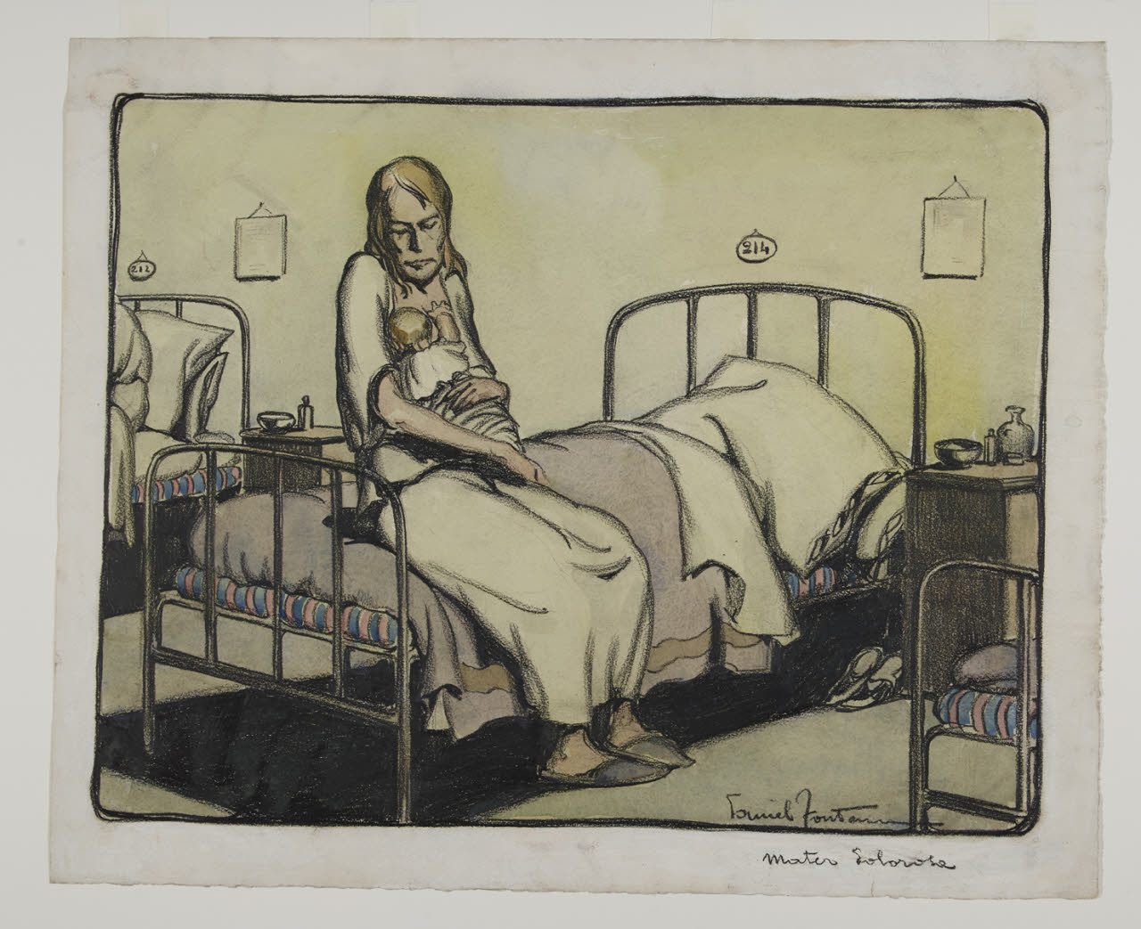 - NOTIZIE STORICO CRITICHE Daniel Fontana - allievo dell’Accademia di Brera - ha lavorato a Roma, affermandosi come illustratore caricaturista e disegnatore satirico, oltre che come pittore figurativo e di genere. Nella sua molteplice attività ha saputo rilevare i caratteri armoniosi del paesaggio lombardo e mostrare con le sue illustrazioni le gioie e le tragiche vicende umane. La sua fortuna artistica inizia con la collaborazione in diversi periodici milanesi e con la partecipazione a numerosi eventi espositivi; sua è, inoltre, la raffigurazione della "donna turrita" dell’Italia, per anni simbolo ufficiale del governo e dello Stato Italiano.\nSempre sensibile alla sofferenza dell’uomo, nel 1925 Fontana realizza un ciclo di 18 struggenti disegni (pubblicati all’interno di un album ormai di difficile reperimento); questi fogli furono donati dalla Famiglia Menighina, società di cultura milanese, alle civiche raccolte pubbliche del capoluogo lombardo, probabilmente dopo una mostra collettiva organizzata dalla società stessa nel 1928. Sono "diciotto stazioni doloranti, superstiti e ridotte, perchè il Fontana volle stroncata la sequela di maggiori miserie, che nel pensiero creativo documentano la potenza del disegnatore serrato, la intensità espressiva, il fine sociale cui l’arte deve tendere, e attanagliano, stringendo il cuore e il cervello"(Accetti 1931). Ma alla comprensione verso il prossimo, verso la sofferenza e la miseria degli ultimi, i poveri e i sofferenti, l’artista si sofferma con solerte frequenza nel corso di tutta la sua esistenza. Nel 1950, infatti, in occasione della quindicesima mostra personale milanese, Fontana presenta un’altra serie di opere sul tema della povertà, nel cui opuscolo descrive l’impegno profuso verso questo genere di tematiche :"Ho sempre seguito il mio «povero cristo» nel suo duro cammino, dalla creazione del mio affannoso «Il calvario dei vinti» (1925) all’esaltazione del suo anonimo olocausto per la difersa di un’idea e nella disperante guerra del pane contro l’oro [...]"(Daniele Fontana... 1950). In queste narrazioni grafiche, conservate oggi all’interno del Civico Gabinetto di Disegni del Castello Sforzesco, Fontana attraverso un liguaggio chiaro e persuasivo rappresentata la Milano che soffre, emarginata e ignorata nel suo dolore. Sono uomini e donne abbandonati alla più avvilente miseria morale e fisica, emaciati dalla povertà, dalla guerra e dalle tristi conseguenze della cattiva sorte. Madri dolenti con il volto che ricalca quello di un Cristo sofferente, emigrati e poveri affamati che popolano le stazioni, uomini stanchi all’interno di sale d’attesa ricolme di bagagli, seduti alle mense dei poveri e nei ricoveri notturni. A tutti loro l’artista guarda attraverso una minuziosa osservazione dal vero, che ricrea attraverso elementi espressivi che a tratti sfociano nella caricatura, senza mai minimizzare la sofferenza di quei derelitti senza pace. L’artista, attraverso una meravigliosa sintesi espressiva, riesce così a esprimere con morbidi tratti di carboncino e tenue velature di acquerello figure palpitanti di vita e di dolore.