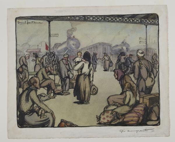 - NOTIZIE STORICO CRITICHE Daniel Fontana - allievo dell’Accademia di Brera - ha lavorato a Roma, affermandosi come illustratore caricaturista e disegnatore satirico, oltre che come pittore figurativo e di genere. Nella sua molteplice attività ha saputo rilevare i caratteri armoniosi del paesaggio lombardo e mostrare con le sue illustrazioni le gioie e le tragiche vicende umane. La sua fortuna artistica inizia con la collaborazione in diversi periodici milanesi e con la partecipazione a numerosi eventi espositivi; sua è, inoltre, la raffigurazione della "donna turrita" dell’Italia, per anni simbolo ufficiale del governo e dello Stato Italiano.\nSempre sensibile alla sofferenza dell’uomo, nel 1925 Fontana realizza un ciclo di 18 struggenti disegni (pubblicati all’interno di un album ormai di difficile reperimento); questi fogli furono donati dalla Famiglia Menighina, società di cultura milanese, alle civiche raccolte pubbliche del capoluogo lombardo, probabilmente dopo una mostra collettiva organizzata dalla società stessa nel 1928. Sono "diciotto stazioni doloranti, superstiti e ridotte, perchè il Fontana volle stroncata la sequela di maggiori miserie, che nel pensiero creativo documentano la potenza del disegnatore serrato, la intensità espressiva, il fine sociale cui l’arte deve tendere, e attanagliano, stringendo il cuore e il cervello"(Accetti 1931). Ma alla comprensione verso il prossimo, verso la sofferenza e la miseria degli ultimi, i poveri e i sofferenti, l’artista si sofferma con solerte frequenza nel corso di tutta la sua esistenza. Nel 1950, infatti, in occasione della quindicesima mostra personale milanese, Fontana presenta un’altra serie di opere sul tema della povertà, nel cui opuscolo descrive l’impegno profuso verso questo genere di tematiche :"Ho sempre seguito il mio «povero cristo» nel suo duro cammino, dalla creazione del mio affannoso «Il calvario dei vinti» (1925) all’esaltazione del suo anonimo olocausto per la difersa di un’idea e nella disperante guerra del pane contro l’oro [...]"(Daniele Fontana... 1950). In queste narrazioni grafiche, conservate oggi all’interno del Civico Gabinetto di Disegni del Castello Sforzesco, Fontana attraverso un liguaggio chiaro e persuasivo rappresentata la Milano che soffre, emarginata e ignorata nel suo dolore. Sono uomini e donne abbandonati alla più avvilente miseria morale e fisica, emaciati dalla povertà, dalla guerra e dalle tristi conseguenze della cattiva sorte. Madri dolenti con il volto che ricalca quello di un Cristo sofferente, emigrati e poveri affamati che popolano le stazioni, uomini stanchi all’interno di sale d’attesa ricolme di bagagli, seduti alle mense dei poveri e nei ricoveri notturni. A tutti loro l’artista guarda attraverso una minuziosa osservazione dal vero, che ricrea attraverso elementi espressivi che a tratti sfociano nella caricatura, senza mai minimizzare la sofferenza di quei derelitti senza pace. L’artista, attraverso una meravigliosa sintesi espressiva, riesce così a esprimere con morbidi tratti di carboncino e tenue velature di acquerello figure palpitanti di vita e di dolore.