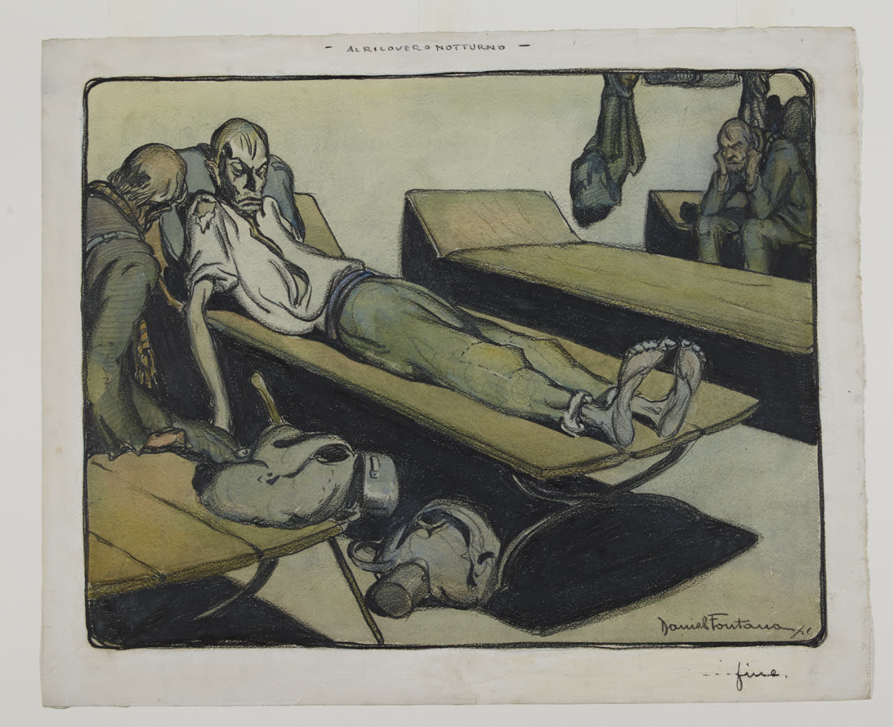 - NOTIZIE STORICO CRITICHE Daniel Fontana - allievo dell’Accademia di Brera - ha lavorato a Roma, affermandosi come illustratore caricaturista e disegnatore satirico, oltre che come pittore figurativo e di genere. Nella sua molteplice attività ha saputo rilevare i caratteri armoniosi del paesaggio lombardo e mostrare con le sue illustrazioni le gioie e le tragiche vicende umane. La sua fortuna artistica inizia con la collaborazione in diversi periodici milanesi e con la partecipazione a numerosi eventi espositivi; sua è, inoltre, la raffigurazione della "donna turrita" dell’Italia, per anni simbolo ufficiale del governo e dello Stato Italiano.\nSempre sensibile alla sofferenza dell’uomo, nel 1925 Fontana realizza un ciclo di 18 struggenti disegni (pubblicati all’interno di un album ormai di difficile reperimento); questi fogli furono donati dalla Famiglia Menighina, società di cultura milanese, alle civiche raccolte pubbliche del capoluogo lombardo, probabilmente dopo una mostra collettiva organizzata dalla società stessa nel 1928. Sono "diciotto stazioni doloranti, superstiti e ridotte, perchè il Fontana volle stroncata la sequela di maggiori miserie, che nel pensiero creativo documentano la potenza del disegnatore serrato, la intensità espressiva, il fine sociale cui l’arte deve tendere, e attanagliano, stringendo il cuore e il cervello"(Accetti 1931). Ma alla comprensione verso il prossimo, verso la sofferenza e la miseria degli ultimi, i poveri e i sofferenti, l’artista si sofferma con solerte frequenza nel corso di tutta la sua esistenza. Nel 1950, infatti, in occasione della quindicesima mostra personale milanese, Fontana presenta un’altra serie di opere sul tema della povertà, nel cui opuscolo descrive l’impegno profuso verso questo genere di tematiche :"Ho sempre seguito il mio «povero cristo» nel suo duro cammino, dalla creazione del mio affannoso «Il calvario dei vinti» (1925) all’esaltazione del suo anonimo olocausto per la difersa di un’idea e nella disperante guerra del pane contro l’oro [...]"(Daniele Fontana... 1950). In queste narrazioni grafiche, conservate oggi all’interno del Civico Gabinetto di Disegni del Castello Sforzesco, Fontana attraverso un liguaggio chiaro e persuasivo rappresentata la Milano che soffre, emarginata e ignorata nel suo dolore. Sono uomini e donne abbandonati alla più avvilente miseria morale e fisica, emaciati dalla povertà, dalla guerra e dalle tristi conseguenze della cattiva sorte. Madri dolenti con il volto che ricalca quello di un Cristo sofferente, emigrati e poveri affamati che popolano le stazioni, uomini stanchi all’interno di sale d’attesa ricolme di bagagli, seduti alle mense dei poveri e nei ricoveri notturni. A tutti loro l’artista guarda attraverso una minuziosa osservazione dal vero, che ricrea attraverso elementi espressivi che a tratti sfociano nella caricatura, senza mai minimizzare la sofferenza di quei derelitti senza pace. L’artista, attraverso una meravigliosa sintesi espressiva, riesce così a esprimere con morbidi tratti di carboncino e tenue velature di acquerello figure palpitanti di vita e di dolore.