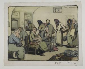 - NOTIZIE STORICO CRITICHE Daniel Fontana - allievo dell’Accademia di Brera - ha lavorato a Roma, affermandosi come illustratore caricaturista e disegnatore satirico, oltre che come pittore figurativo e di genere. Nella sua molteplice attività ha saputo rilevare i caratteri armoniosi del paesaggio lombardo e mostrare con le sue illustrazioni le gioie e le tragiche vicende umane. La sua fortuna artistica inizia con la collaborazione in diversi periodici milanesi e con la partecipazione a numerosi eventi espositivi; sua è, inoltre, la raffigurazione della "donna turrita" dell’Italia, per anni simbolo ufficiale del governo e dello Stato Italiano.\nSempre sensibile alla sofferenza dell’uomo, nel 1925 Fontana realizza un ciclo di 18 struggenti disegni (pubblicati all’interno di un album ormai di difficile reperimento); questi fogli furono donati dalla Famiglia Menighina, società di cultura milanese, alle civiche raccolte pubbliche del capoluogo lombardo, probabilmente dopo una mostra collettiva organizzata dalla società stessa nel 1928. Sono "diciotto stazioni doloranti, superstiti e ridotte, perchè il Fontana volle stroncata la sequela di maggiori miserie, che nel pensiero creativo documentano la potenza del disegnatore serrato, la intensità espressiva, il fine sociale cui l’arte deve tendere, e attanagliano, stringendo il cuore e il cervello"(Accetti 1931). Ma alla comprensione verso il prossimo, verso la sofferenza e la miseria degli ultimi, i poveri e i sofferenti, l’artista si sofferma con solerte frequenza nel corso di tutta la sua esistenza. Nel 1950, infatti, in occasione della quindicesima mostra personale milanese, Fontana presenta un’altra serie di opere sul tema della povertà, nel cui opuscolo descrive l’impegno profuso verso questo genere di tematiche :"Ho sempre seguito il mio «povero cristo» nel suo duro cammino, dalla creazione del mio affannoso «Il calvario dei vinti» (1925) all’esaltazione del suo anonimo olocausto per la difersa di un’idea e nella disperante guerra del pane contro l’oro [...]"(Daniele Fontana... 1950). In queste narrazioni grafiche, conservate oggi all’interno del Civico Gabinetto di Disegni del Castello Sforzesco, Fontana attraverso un liguaggio chiaro e persuasivo rappresentata la Milano che soffre, emarginata e ignorata nel suo dolore. Sono uomini e donne abbandonati alla più avvilente miseria morale e fisica, emaciati dalla povertà, dalla guerra e dalle tristi conseguenze della cattiva sorte. Madri dolenti con il volto che ricalca quello di un Cristo sofferente, emigrati e poveri affamati che popolano le stazioni, uomini stanchi all’interno di sale d’attesa ricolme di bagagli, seduti alle mense dei poveri e nei ricoveri notturni. A tutti loro l’artista guarda attraverso una minuziosa osservazione dal vero, che ricrea attraverso elementi espressivi che a tratti sfociano nella caricatura, senza mai minimizzare la sofferenza di quei derelitti senza pace. L’artista, attraverso una meravigliosa sintesi espressiva, riesce così a esprimere con morbidi tratti di carboncino e tenue velature di acquerello figure palpitanti di vita e di dolore.