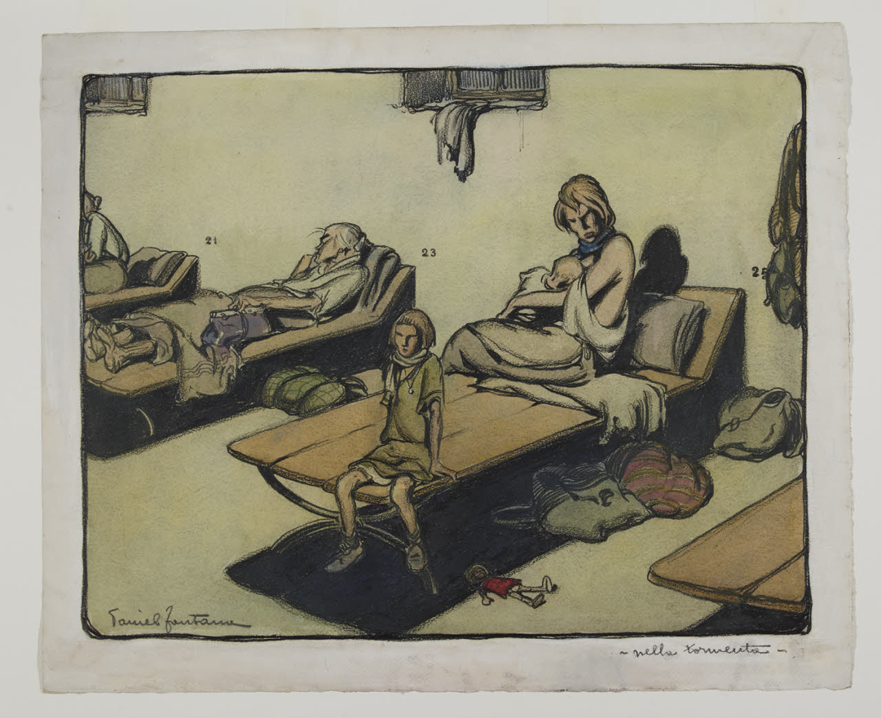 - NOTIZIE STORICO CRITICHE Daniel Fontana - allievo dell’Accademia di Brera - ha lavorato a Roma, affermandosi come illustratore caricaturista e disegnatore satirico, oltre che come pittore figurativo e di genere. Nella sua molteplice attività ha saputo rilevare i caratteri armoniosi del paesaggio lombardo e mostrare con le sue illustrazioni le gioie e le tragiche vicende umane. La sua fortuna artistica inizia con la collaborazione in diversi periodici milanesi e con la partecipazione a numerosi eventi espositivi; sua è, inoltre, la raffigurazione della "donna turrita" dell’Italia, per anni simbolo ufficiale del governo e dello Stato Italiano.\nSempre sensibile alla sofferenza dell’uomo, nel 1925 Fontana realizza un ciclo di 18 struggenti disegni (pubblicati all’interno di un album ormai di difficile reperimento); questi fogli furono donati dalla Famiglia Menighina, società di cultura milanese, alle civiche raccolte pubbliche del capoluogo lombardo, probabilmente dopo una mostra collettiva organizzata dalla società stessa nel 1928. Sono "diciotto stazioni doloranti, superstiti e ridotte, perchè il Fontana volle stroncata la sequela di maggiori miserie, che nel pensiero creativo documentano la potenza del disegnatore serrato, la intensità espressiva, il fine sociale cui l’arte deve tendere, e attanagliano, stringendo il cuore e il cervello"(Accetti 1931). Ma alla comprensione verso il prossimo, verso la sofferenza e la miseria degli ultimi, i poveri e i sofferenti, l’artista si sofferma con solerte frequenza nel corso di tutta la sua esistenza. Nel 1950, infatti, in occasione della quindicesima mostra personale milanese, Fontana presenta un’altra serie di opere sul tema della povertà, nel cui opuscolo descrive l’impegno profuso verso questo genere di tematiche :"Ho sempre seguito il mio «povero cristo» nel suo duro cammino, dalla creazione del mio affannoso «Il calvario dei vinti» (1925) all’esaltazione del suo anonimo olocausto per la difersa di un’idea e nella disperante guerra del pane contro l’oro [...]"(Daniele Fontana... 1950). In queste narrazioni grafiche, conservate oggi all’interno del Civico Gabinetto di Disegni del Castello Sforzesco, Fontana attraverso un liguaggio chiaro e persuasivo rappresentata la Milano che soffre, emarginata e ignorata nel suo dolore. Sono uomini e donne abbandonati alla più avvilente miseria morale e fisica, emaciati dalla povertà, dalla guerra e dalle tristi conseguenze della cattiva sorte. Madri dolenti con il volto che ricalca quello di un Cristo sofferente, emigrati e poveri affamati che popolano le stazioni, uomini stanchi all’interno di sale d’attesa ricolme di bagagli, seduti alle mense dei poveri e nei ricoveri notturni. A tutti loro l’artista guarda attraverso una minuziosa osservazione dal vero, che ricrea attraverso elementi espressivi che a tratti sfociano nella caricatura, senza mai minimizzare la sofferenza di quei derelitti senza pace. L’artista, attraverso una meravigliosa sintesi espressiva, riesce così a esprimere con morbidi tratti di carboncino e tenue velature di acquerello figure palpitanti di vita e di dolore.