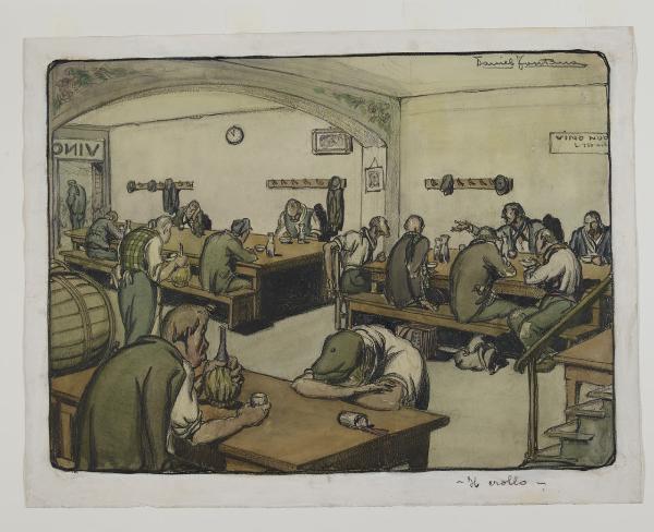 - NOTIZIE STORICO CRITICHE Daniel Fontana - allievo dell’Accademia di Brera - ha lavorato a Roma, affermandosi come illustratore caricaturista e disegnatore satirico, oltre che come pittore figurativo e di genere. Nella sua molteplice attività ha saputo rilevare i caratteri armoniosi del paesaggio lombardo e mostrare con le sue illustrazioni le gioie e le tragiche vicende umane. La sua fortuna artistica inizia con la collaborazione in diversi periodici milanesi e con la partecipazione a numerosi eventi espositivi; sua è, inoltre, la raffigurazione della "donna turrita" dell’Italia, per anni simbolo ufficiale del governo e dello Stato Italiano.\nSempre sensibile alla sofferenza dell’uomo, nel 1925 Fontana realizza un ciclo di 18 struggenti disegni (pubblicati all’interno di un album ormai di difficile reperimento); questi fogli furono donati dalla Famiglia Menighina, società di cultura milanese, alle civiche raccolte pubbliche del capoluogo lombardo, probabilmente dopo una mostra collettiva organizzata dalla società stessa nel 1928. Sono "diciotto stazioni doloranti, superstiti e ridotte, perchè il Fontana volle stroncata la sequela di maggiori miserie, che nel pensiero creativo documentano la potenza del disegnatore serrato, la intensità espressiva, il fine sociale cui l’arte deve tendere, e attanagliano, stringendo il cuore e il cervello"(Accetti 1931). Ma alla comprensione verso il prossimo, verso la sofferenza e la miseria degli ultimi, i poveri e i sofferenti, l’artista si sofferma con solerte frequenza nel corso di tutta la sua esistenza. Nel 1950, infatti, in occasione della quindicesima mostra personale milanese, Fontana presenta un’altra serie di opere sul tema della povertà, nel cui opuscolo descrive l’impegno profuso verso questo genere di tematiche :"Ho sempre seguito il mio «povero cristo» nel suo duro cammino, dalla creazione del mio affannoso «Il calvario dei vinti» (1925) all’esaltazione del suo anonimo olocausto per la difersa di un’idea e nella disperante guerra del pane contro l’oro [...]"(Daniele Fontana... 1950). In queste narrazioni grafiche, conservate oggi all’interno del Civico Gabinetto di Disegni del Castello Sforzesco, Fontana attraverso un liguaggio chiaro e persuasivo rappresentata la Milano che soffre, emarginata e ignorata nel suo dolore. Sono uomini e donne abbandonati alla più avvilente miseria morale e fisica, emaciati dalla povertà, dalla guerra e dalle tristi conseguenze della cattiva sorte. Madri dolenti con il volto che ricalca quello di un Cristo sofferente, emigrati e poveri affamati che popolano le stazioni, uomini stanchi all’interno di sale d’attesa ricolme di bagagli, seduti alle mense dei poveri e nei ricoveri notturni. A tutti loro l’artista guarda attraverso una minuziosa osservazione dal vero, che ricrea attraverso elementi espressivi che a tratti sfociano nella caricatura, senza mai minimizzare la sofferenza di quei derelitti senza pace. L’artista, attraverso una meravigliosa sintesi espressiva, riesce così a esprimere con morbidi tratti di carboncino e tenue velature di acquerello figure palpitanti di vita e di dolore.