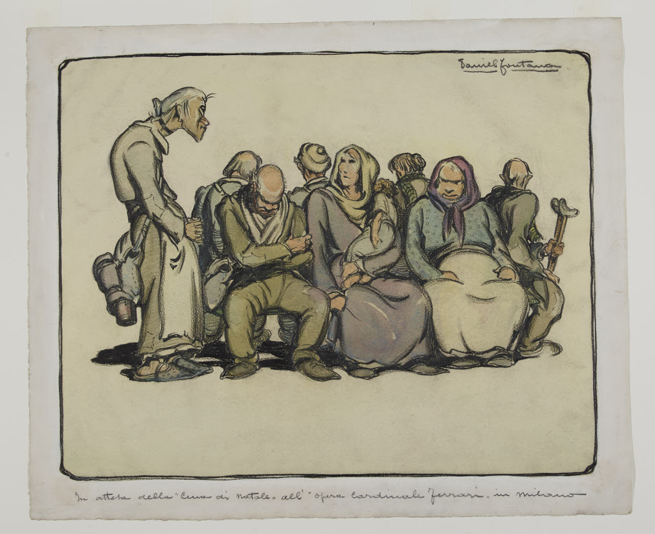 - NOTIZIE STORICO CRITICHE Daniel Fontana - allievo dell’Accademia di Brera - ha lavorato a Roma, affermandosi come illustratore caricaturista e disegnatore satirico, oltre che come pittore figurativo e di genere. Nella sua molteplice attività ha saputo rilevare i caratteri armoniosi del paesaggio lombardo e mostrare con le sue illustrazioni le gioie e le tragiche vicende umane. La sua fortuna artistica inizia con la collaborazione in diversi periodici milanesi e con la partecipazione a numerosi eventi espositivi; sua è, inoltre, la raffigurazione della "donna turrita" dell’Italia, per anni simbolo ufficiale del governo e dello Stato Italiano.\nSempre sensibile alla sofferenza dell’uomo, nel 1925 Fontana realizza un ciclo di 18 struggenti disegni (pubblicati all’interno di un album ormai di difficile reperimento); questi fogli furono donati dalla Famiglia Menighina, società di cultura milanese, alle civiche raccolte pubbliche del capoluogo lombardo, probabilmente dopo una mostra collettiva organizzata dalla società stessa nel 1928. Sono "diciotto stazioni doloranti, superstiti e ridotte, perchè il Fontana volle stroncata la sequela di maggiori miserie, che nel pensiero creativo documentano la potenza del disegnatore serrato, la intensità espressiva, il fine sociale cui l’arte deve tendere, e attanagliano, stringendo il cuore e il cervello"(Accetti 1931). Ma alla comprensione verso il prossimo, verso la sofferenza e la miseria degli ultimi, i poveri e i sofferenti, l’artista si sofferma con solerte frequenza nel corso di tutta la sua esistenza. Nel 1950, infatti, in occasione della quindicesima mostra personale milanese, Fontana presenta un’altra serie di opere sul tema della povertà, nel cui opuscolo descrive l’impegno profuso verso questo genere di tematiche :"Ho sempre seguito il mio «povero cristo» nel suo duro cammino, dalla creazione del mio affannoso «Il calvario dei vinti» (1925) all’esaltazione del suo anonimo olocausto per la difersa di un’idea e nella disperante guerra del pane contro l’oro [...]"(Daniele Fontana... 1950). In queste narrazioni grafiche, conservate oggi all’interno del Civico Gabinetto di Disegni del Castello Sforzesco, Fontana attraverso un liguaggio chiaro e persuasivo rappresentata la Milano che soffre, emarginata e ignorata nel suo dolore. Sono uomini e donne abbandonati alla più avvilente miseria morale e fisica, emaciati dalla povertà, dalla guerra e dalle tristi conseguenze della cattiva sorte. Madri dolenti con il volto che ricalca quello di un Cristo sofferente, emigrati e poveri affamati che popolano le stazioni, uomini stanchi all’interno di sale d’attesa ricolme di bagagli, seduti alle mense dei poveri e nei ricoveri notturni. A tutti loro l’artista guarda attraverso una minuziosa osservazione dal vero, che ricrea attraverso elementi espressivi che a tratti sfociano nella caricatura, senza mai minimizzare la sofferenza di quei derelitti senza pace. L’artista, attraverso una meravigliosa sintesi espressiva, riesce così a esprimere con morbidi tratti di carboncino e tenue velature di acquerello figure palpitanti di vita e di dolore.