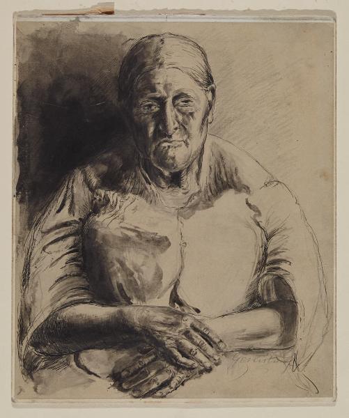 - NOTIZIE STORICO CRITICHE In una Napoli scalpitante e febbrile, Vincenzo Gemito descrive nelle sue opere una realtà popolaresca e vibrante, scrutata dai suoi occhi intensi e penetranti. Nelle sue opere l'artista raccoglie gli sguardi di bambine, modelle e donne di ogni età, ritratte amorevolmente con gesto veloce e sicuro attraverso i più svariati mezzi tecnici: matita, sanguigna, penna e acquerello. Il disegno con lo "Studio di una mezza figura di vecchia", legato da Isaja Zancone nel 1931 alle Civiche Raccolte milanesi, ritrae con tratti rapidi e incisivi d'inchiostro nero di china, un'anziana donna dall'espressione malinconica che rivolge lo sguardo a un ipotetico osservatore. In posizione eretta e raffigurata a mezzo busto, la donna incrocia le braccia sul ventre e mostra a chi guarda le proprie mani rugose. Il volto paffuto e la capigliatura raccolta sono evidenziati da un sapiente chiaroscuro, il quale dona alla figura un particolare fascino espressivo.