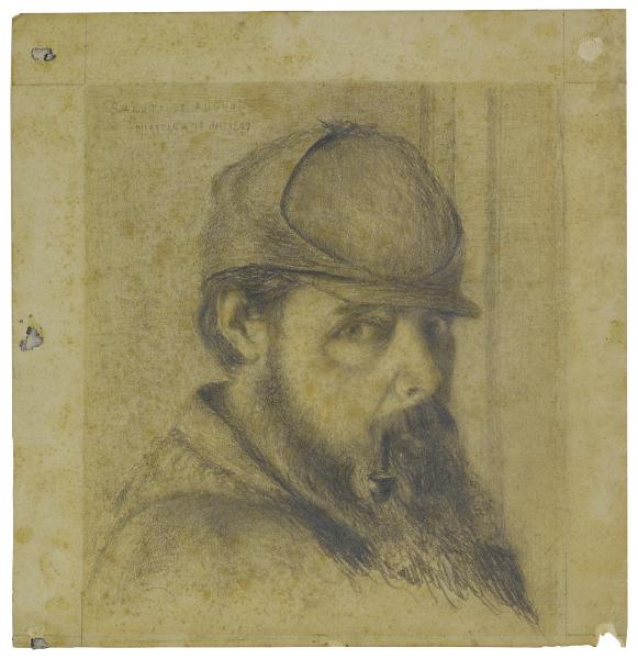 - NOTIZIE STORICO CRITICHE Se relativamente modesto è il numero di ritratti che raffigurano Vittore Grubicy de Dragon, sicuramente minore è il numero di autoritratti. Tra questi, il disegno del 1897 è stato realizzato dall'artista in uno dei suoi soggiorni a Miazzina, località amata dal pittore dove trascorse gli inverni tra il 1892 e il 1898, operando per la maggior parte in solitudine e a contatto con la natura (Rebora 1995). Qui realizzò numerosi studi dal vero, a matita e a carboncino, su fogli di piccolo formato, molti appartenenti a taccuini di viaggio, nei quali vengono rappresentate scene di vita campestre, in immagini d'insieme o in piccoli dettagli, oltre che paesaggi e vedute della cittadina. Negli occhi del pittore sembra riflettersi l'immagine di chi lo osserva. Grubicy si dona così all'osservatore in maniera intima e riservata, mostrando una personalità generosa che si contrappone alla lontana immagine del superuomo, con cui amici e pittori lo raffigurarono. Per "la differenza del tratto - da pastoso a segmentato- riscontrabile in alcune zone del foglio", Sergio Rebora ipotizza che l'opera sia stata terminata in un momento differente da quello iniziale (Ivi).