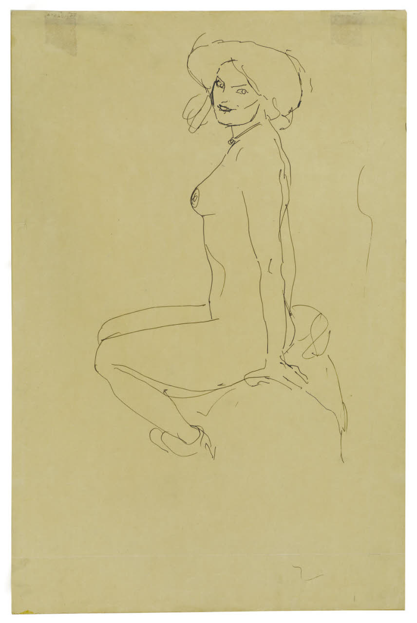 - NOTIZIE STORICO CRITICHE Il nudo femminile del Gabinetto di Disegni del Castello Sforzesco, acquistato nel febbraio del 1932 durante la vendita da parte degli eredi del patrimonio artistico appartenuto al collezionista Benzoni (noto soprattutto per essere stato uno dei primi amatori dell'Ottocento italiano), si colloca all'interno della produzione di Klimt come uno di quei disegni che colpisce per la sua immediata spontaneità. La figura seducente della donna, ammicca a un ipotetico osservatore con sguardo provocante, mostrando il proprio corpo e manifestando il proprio desiderio. Nell'opera, così come in altre di Klimt, il corpo nudo della donna è quindi inconfondibilmente teso verso l'atto erotico, attraverso un'espressione avida, maliziosa, ma allo stesso beffarda. Nel foglio in questione Klimt mostra una predilezione per la sintesi descrittiva della figura; la sagoma della donna, infatti, è resa attraverso una sinuosa linea continua d'inchiostro, uno schizzo veloce e uniforme, in cui non vi sono tratti che si sovrappongono, tranne che nella parte che contorna il viso, parzialmente avvolto da una folta capigliatura. L'artista qui evita di indulgere in estetismi anatomici a favore di una resa più secca; data da una linea ininterrotta che ripercorre la forma della donna e del panneggio.