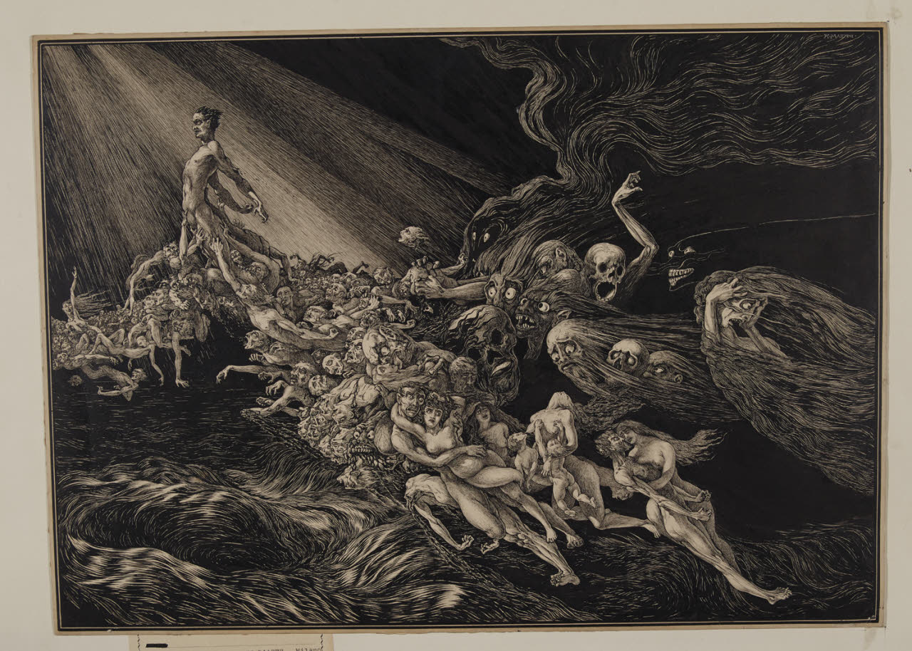 - NOTIZIE STORICO CRITICHE Nel 1919, all’interno della Galleria Pesaro, con una mostra personale presenta in catalogo da Vittorio Pica, Alberto Martini espone più di 180 opere tra disegni a matita, pastelli, inchiostri, pitture e incisioni. In questa occasione fu esposto "Gli orrori della guerra", disegno donato al comune di Milano dalla Galleria Dedalo nel 1933 e oggi conservato all’interno del Civico Gabinetti di Disegni del Castello Sforzesco. Si tratta di uno splendido cartoncino realizzato a penna e inchiostro di china e descritto dal critico pantaeuropeo come un’opera "di tragica grandiosità e di movimentata efficacia espressiva nelle sue ristrette dimensioni" (Pica 1908). \nIl disegno, già esposto a Milano alla Mostra nazionale di Belle Arti nel 1906 - dove concorre per il premio bandito dall’Unione Lombarda della società Internazionale della Pace -, è citato da Papini in un saggio su Alberto Martini nel primo numero di "Vita d’Arte " ed è illustrato da Pica nel 1908, prima su "Emporium" e subito dopo nella terza serie della rubrica "Attraverso gli albi e le cartelle". Da datare, pertanto, tra il 1905 e il 1906, il disegno riprende i tradizionali soggetti che affascinarono l’artista trevigiano sin dai suoi primi esordi, risalendo all’eleganza della poetica simbolista e dando corpo a un’evocazione dell’occulto, fatta di terrore e di figure agghiaccianti. Chiari sono, infatti, i richiami alla cultura iconografica macabra e satanica e in particolar modo alle opere di Callot, De Groux, Ensor, Fréderic, Goya, Klinger, Rethel, Rops. Al di là delle evidenti influenze iconografiche, la scena raffigura un’allegoria della guerra in cui il vincitore viene innalzato nella luce sinistra sopra una moltitudine di cadaveri e figure mostruose. L’agile tratteggio dell’inchiostro di china e l’ingegnoso accordo di macchie nere dello sfondo, si contrappongono ai bianchi corpi nudi delle figure, creando sull’opera un gioco di rapporti cromatici dalla forte intensità chiaroscurale (Lorandi 1985).