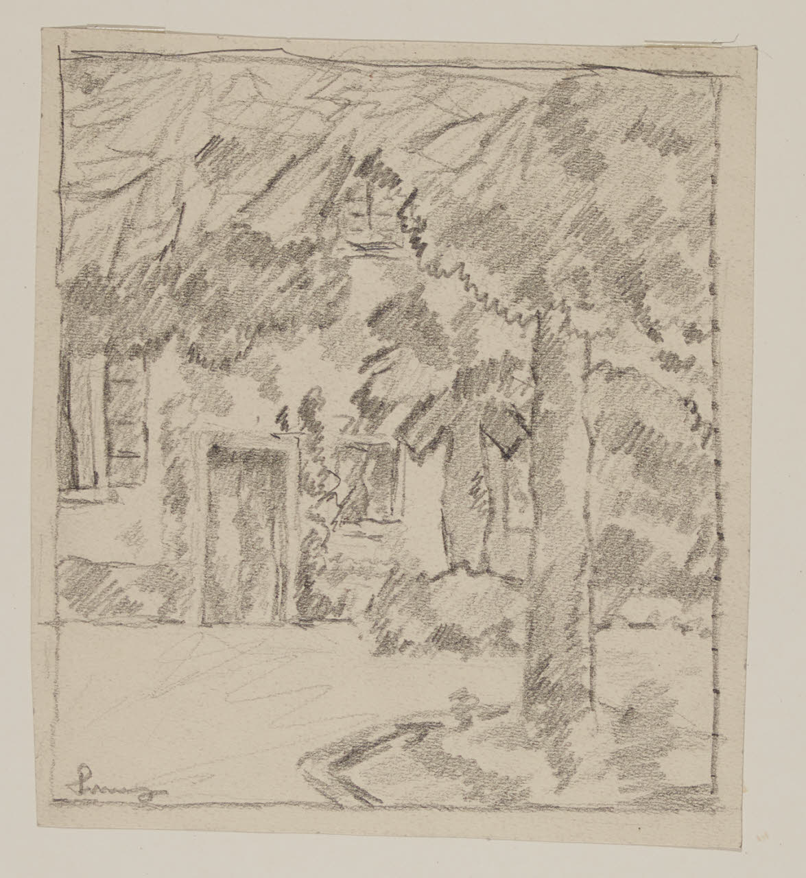 - NOTIZIE STORICO CRITICHE Il disegno può essere confrontato con il dipinto "Albero davanti la villa" (cfr. A. Tiddia, Piero Marussig, Trieste 2015), un olio su tela risalente al 1914, raffigurante la casa dell’artista a Chiadino. Marussig aveva acquistato la proprietà al suo rientro da Parigi, nel 1906, e vi si era stabilito con la famiglia per più di un decennio. Il foglio riprende da un’angolazione diversa lo stesso scorcio del giardino presente nel dipinto con la ricca vegetazione di arbusti e fronde floreali, il prospetto della casa e dell’albero che nella tela appare in secondo piano rispetto al foglio. \nNel disegno, da datare allo stesso periodo, la natura è trasfigurata attraverso un tratto veloce e schematico della matita; le linee, infatti, si intersecano in grossi assi obbliqui senza nessuna pretesa naturalistica o particolare attenzione alla scena reale. L’opera, oggi conservata all’interno del Civico Gabinetto di Disegni del Castello Sforzesco, fu acquistata nel 1940 dalla vedova dell’artista.